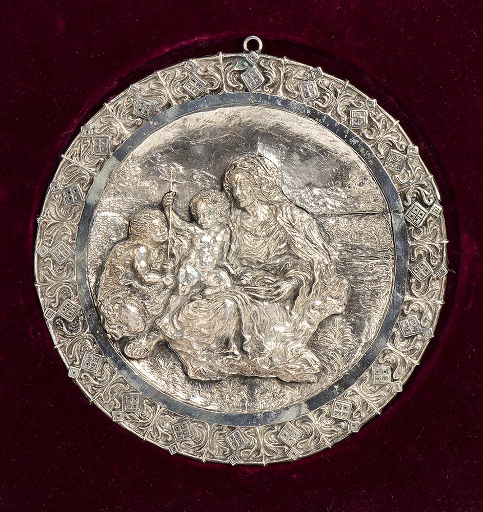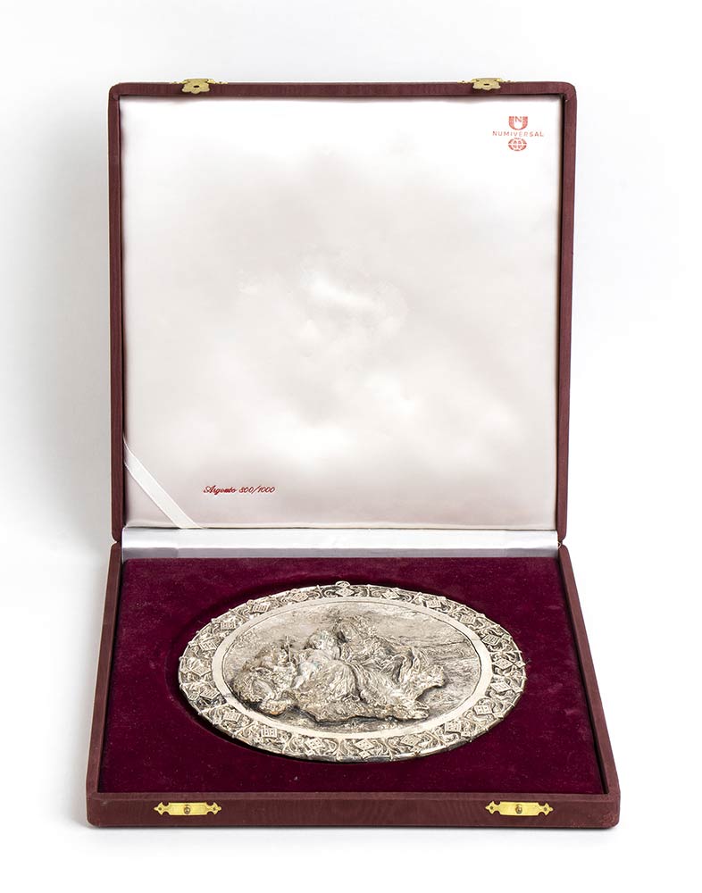 in argento fuso ad alto rilievo. Punzonata "800". Diametro 18,5 cm. Peso 674 gr. Stato di conservazione: **** buono.