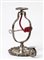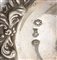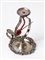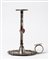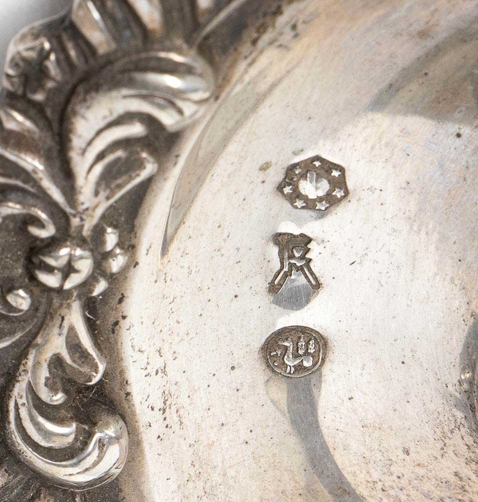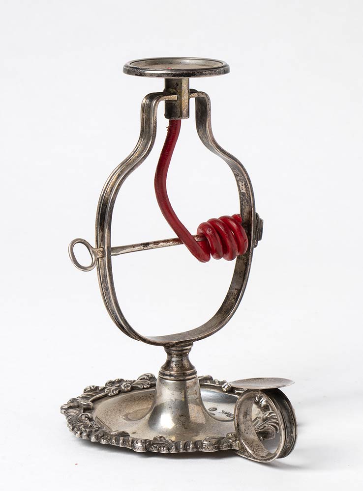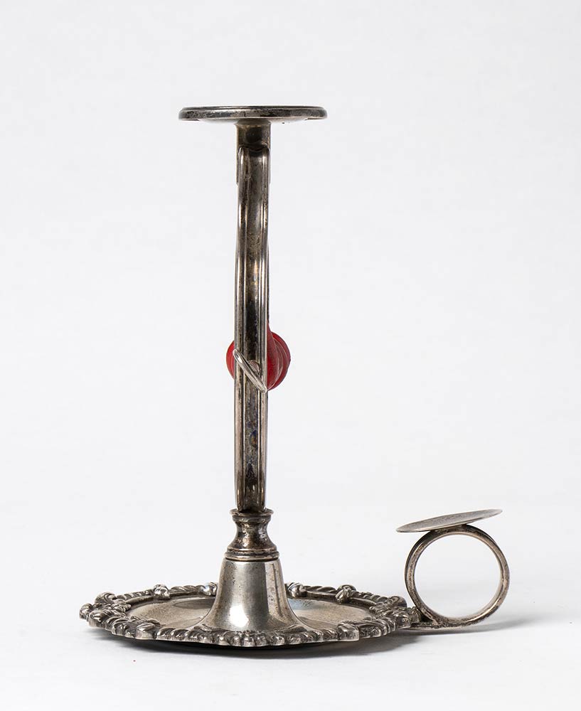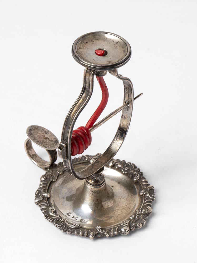 di forma circolare con decorazione perimetrale fogliata. L'avvolgicera centrale sostiene i resti di una bobina di cera. Punzonata Regno Lombardo Veneto, Milano, marchi in uso dal 1812 al 1872 per l'argento al titolo di 800/1000. Dimensioni 11 x 8 cm, altezza 13,5 cm. Peso totale 160 gr. Stato di conservazione: **** buono.