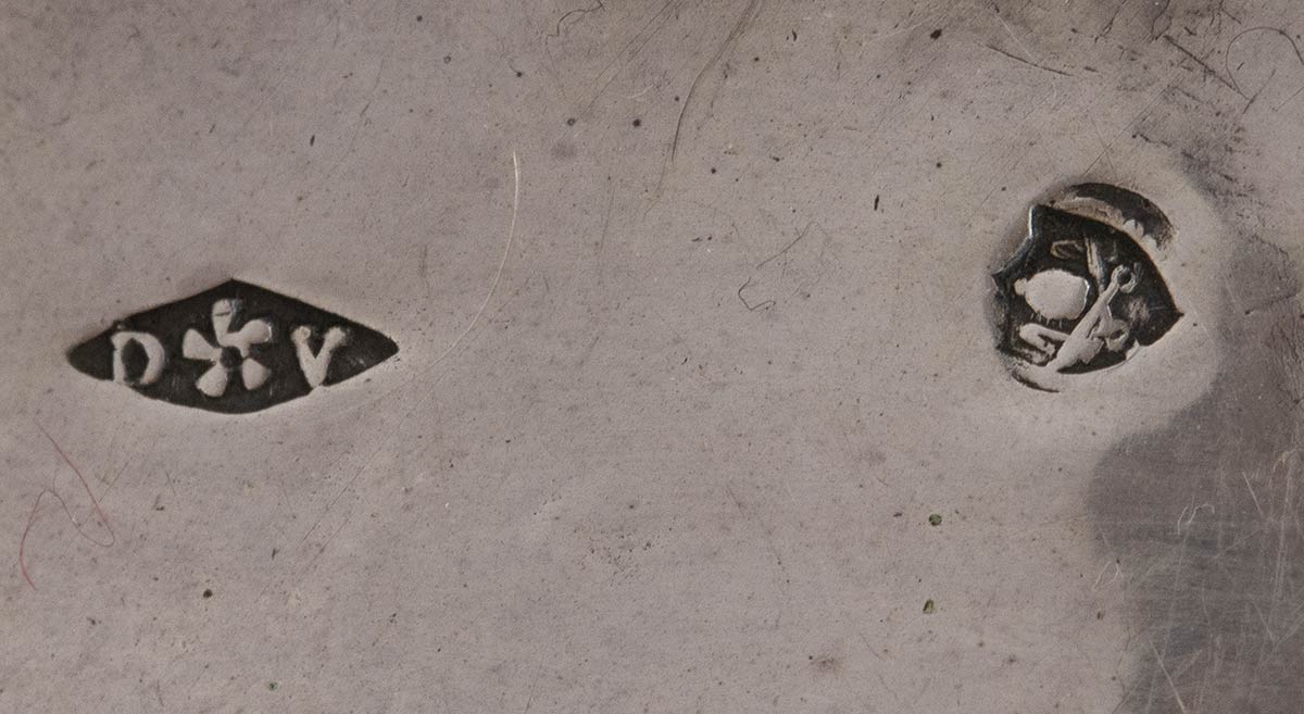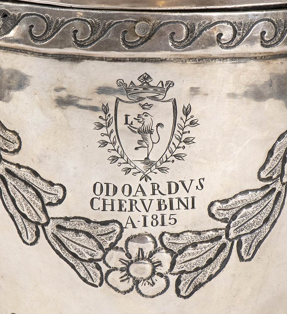 in argento fuso e cesellato con motivi a volute e festoni. Al centro del corpo l'iscrizione "Odoardus Cherubini 1815". Punzonata con il marchio camerale in uso a Roma (Stato Pontificio) dopo il 1815 per l'argento al titolo a 10 once e 16 denari (889/1000), argentiere "D V". Diametro 13 cm. Lunghezza 49 cm. Peso 530 gr. Stato di conservazione: **** buono.