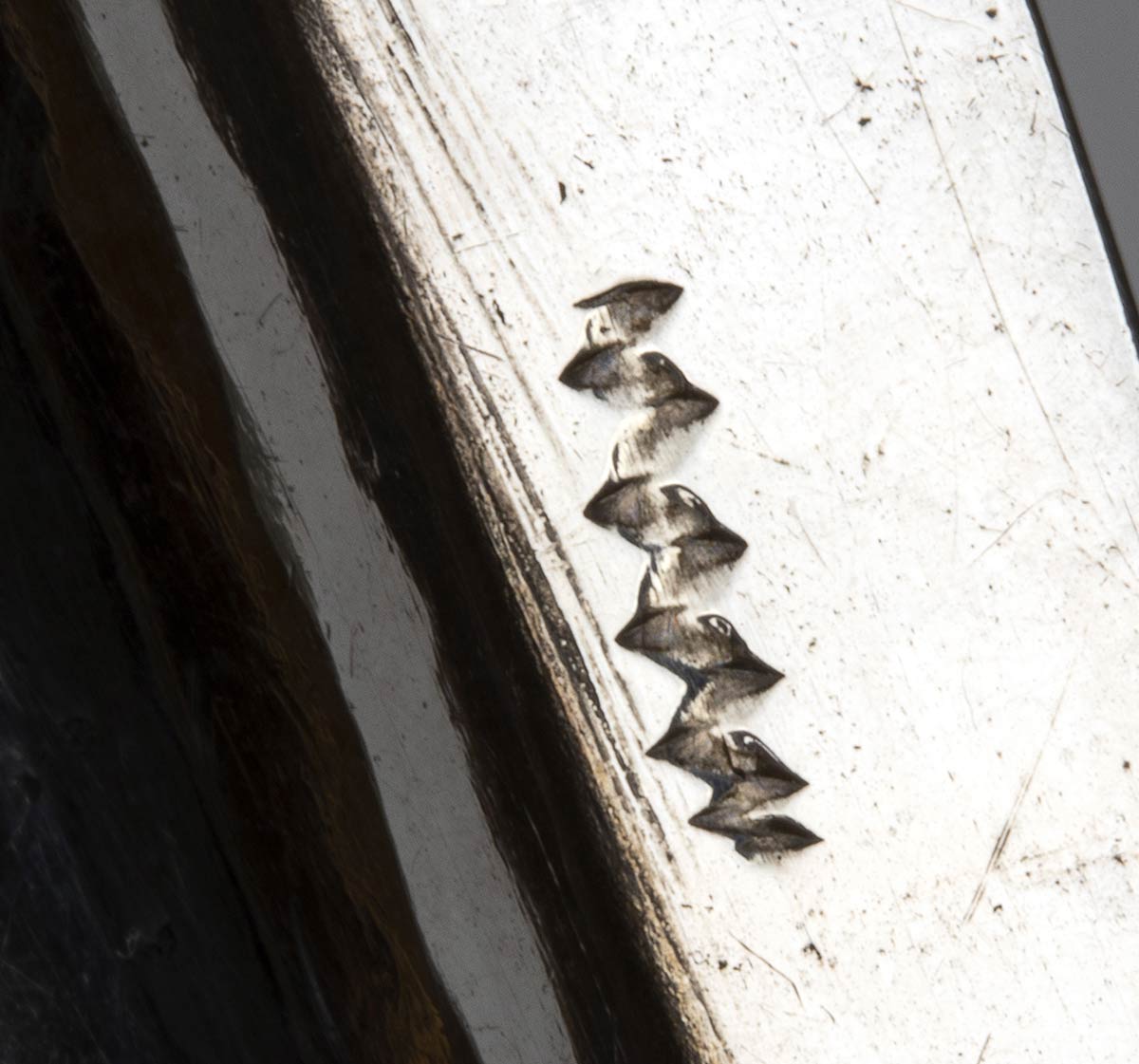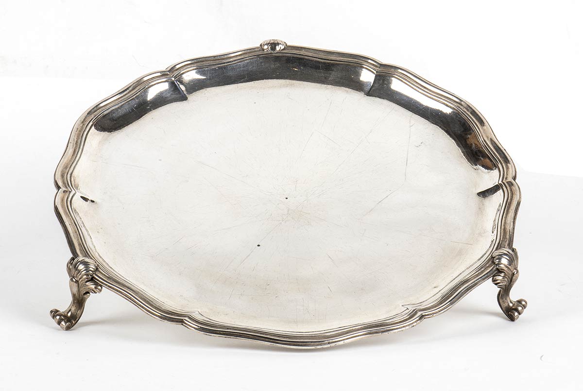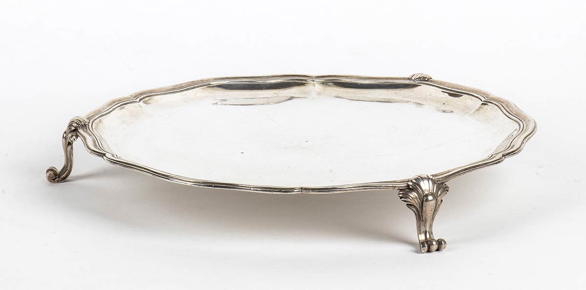 bordo mistilineo poggiante su tre peidini. Punzonato con il marchio della "Torretta" in uso alla corporazione degli Orefici di Genova e del sottostante millesimo relativo al 1772 (Rif. argenti genovesi la Torretta di G.Roccatagliata, ed. Tormena, Genova 1992) e con il marchio "Charancon" per l'importazione in Francia dopo il 1864. Diametro 28 cm, altezza 4,5 cm. Peso 750 gr. Stato di conservazione: **** buono.