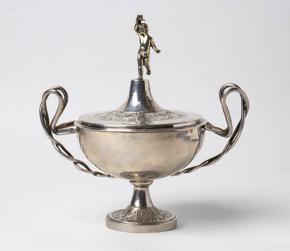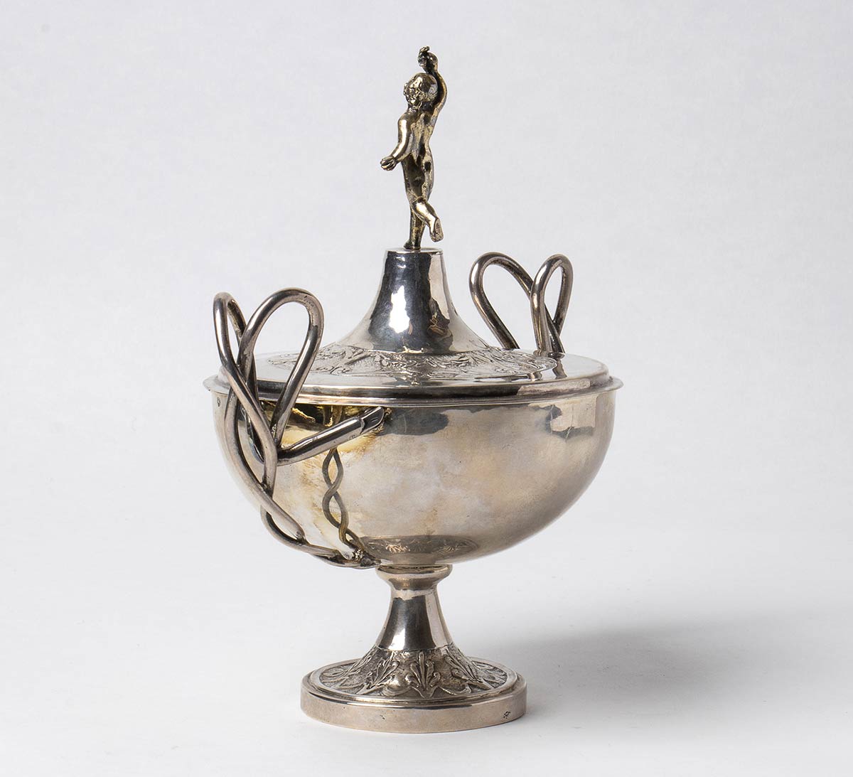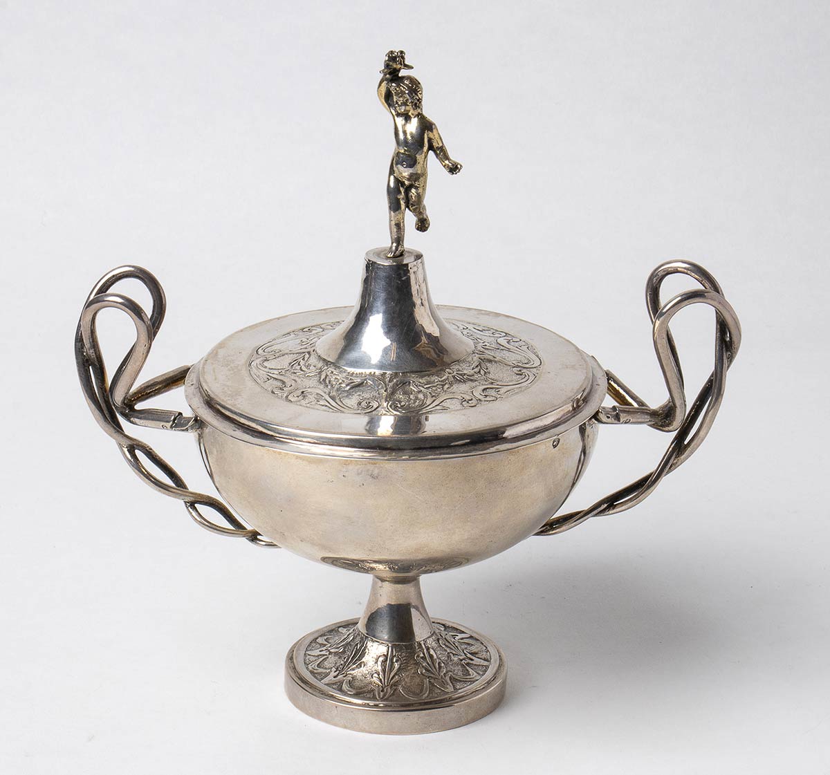 base circolare con manici intrecciati a testa d'anguilla; coperchio cimato da un putto. Punzonata con il marchio camerale in uso a Roma (Stato Pontificio) dopo il 1815 per l'argento al titolo a 10 once e 16 denari (889/1000), argentiere Francesco Colein (1815-1842). Larghezza 18,5 cm, altezza 18,5 cm. Peso totale 349 gr. Stato di conservazione: **** buono.
