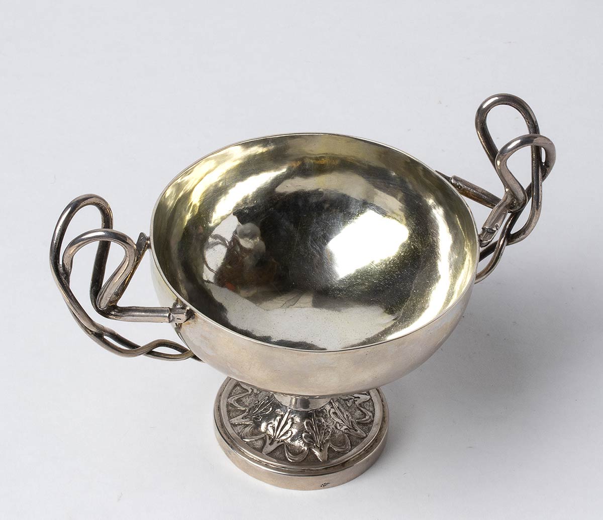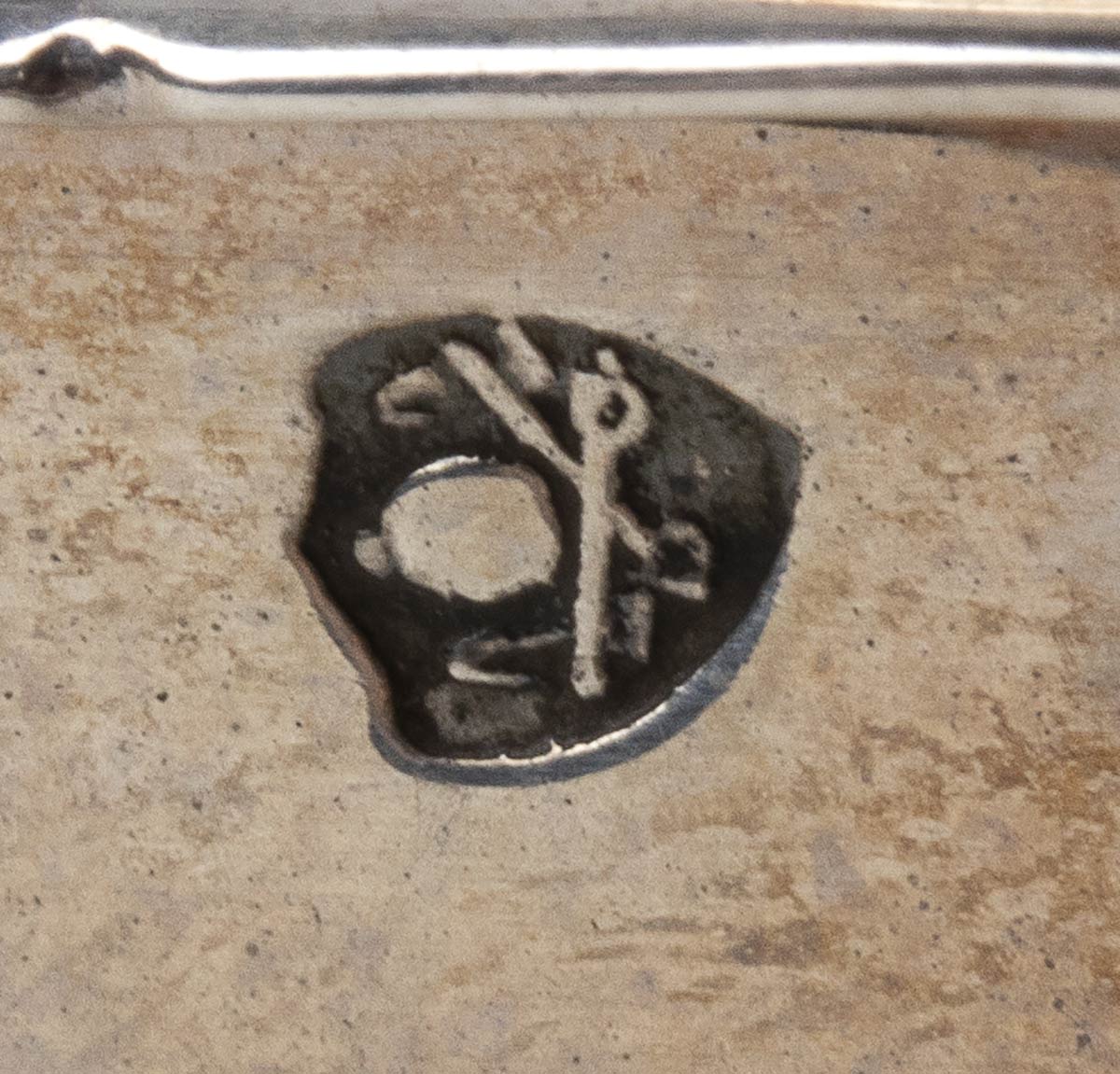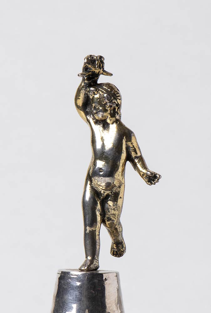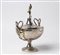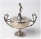 base circolare con manici intrecciati a testa d'anguilla; coperchio cimato da un putto. Punzonata con il marchio camerale in uso a Roma (Stato Pontificio) dopo il 1815 per l'argento al titolo a 10 once e 16 denari (889/1000), argentiere Francesco Colein (1815-1842). Larghezza 18,5 cm, altezza 18,5 cm. Peso totale 349 gr. Stato di conservazione: **** buono.