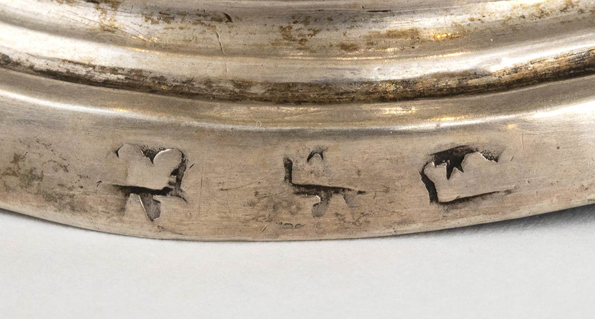 in argento fuso, sbalzato e cesellato, piede sagomato lievemente bombato e fusto a balaustro sul modello dell'argenteria barocca napoletana del XVIII secolo. Punzonato tre volte con il marchio scarsamente leggibile in uso alla corporazione degli Orefici di Napoli. Diametro 13,5 cm, altezza 20,5 cm. Peso 633 gr. Stato di conservazione: **** buono.