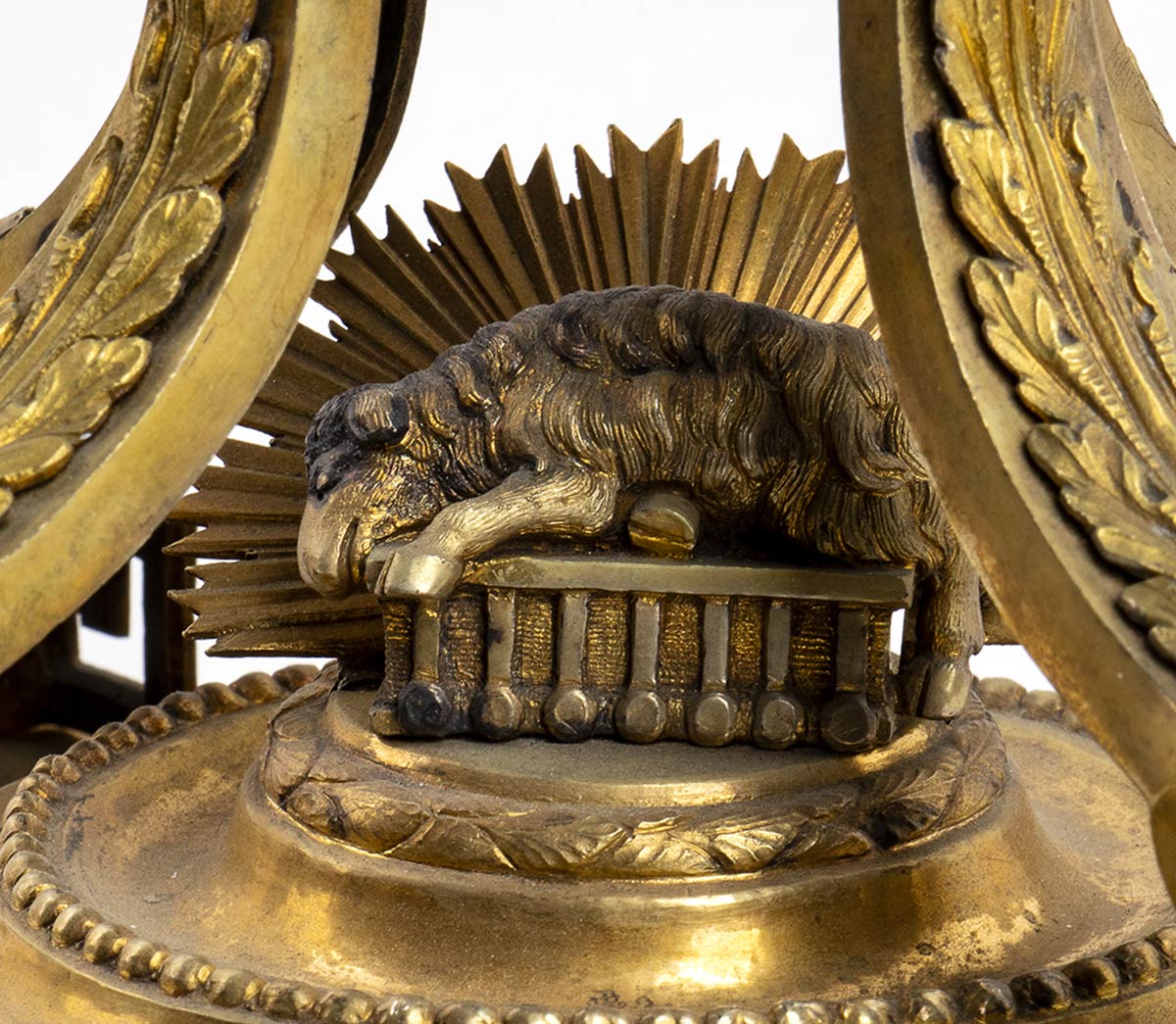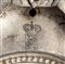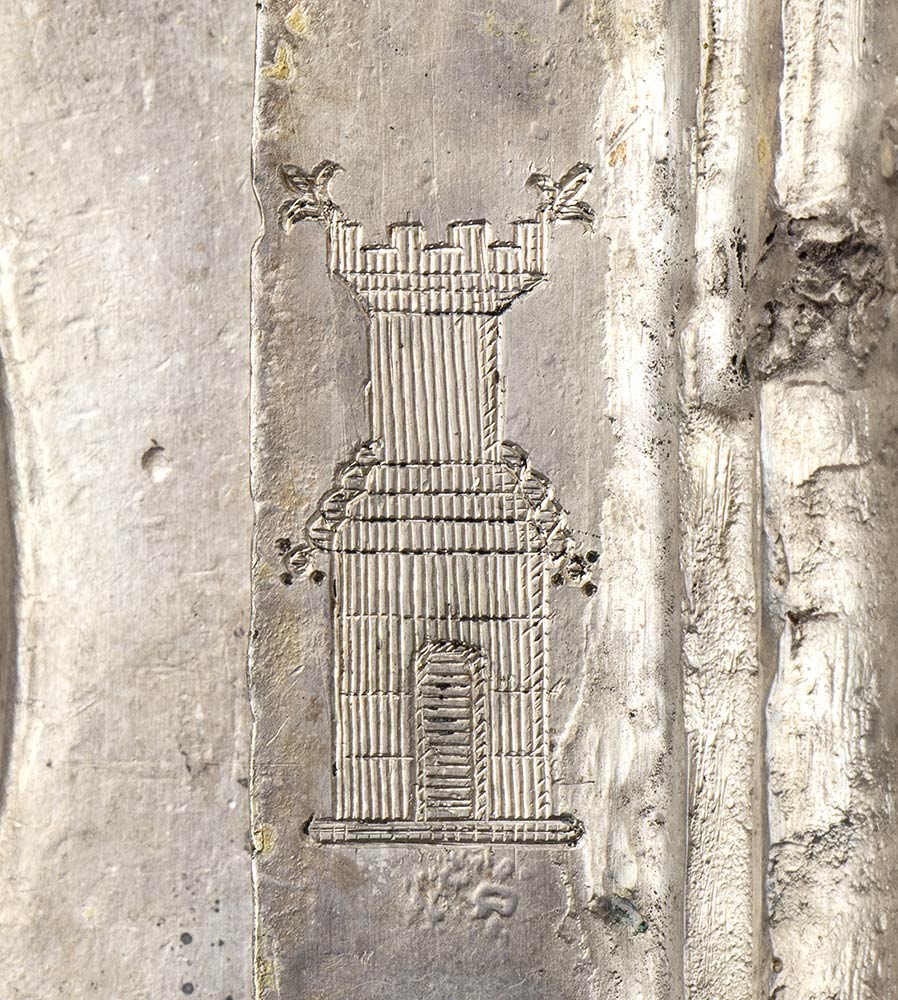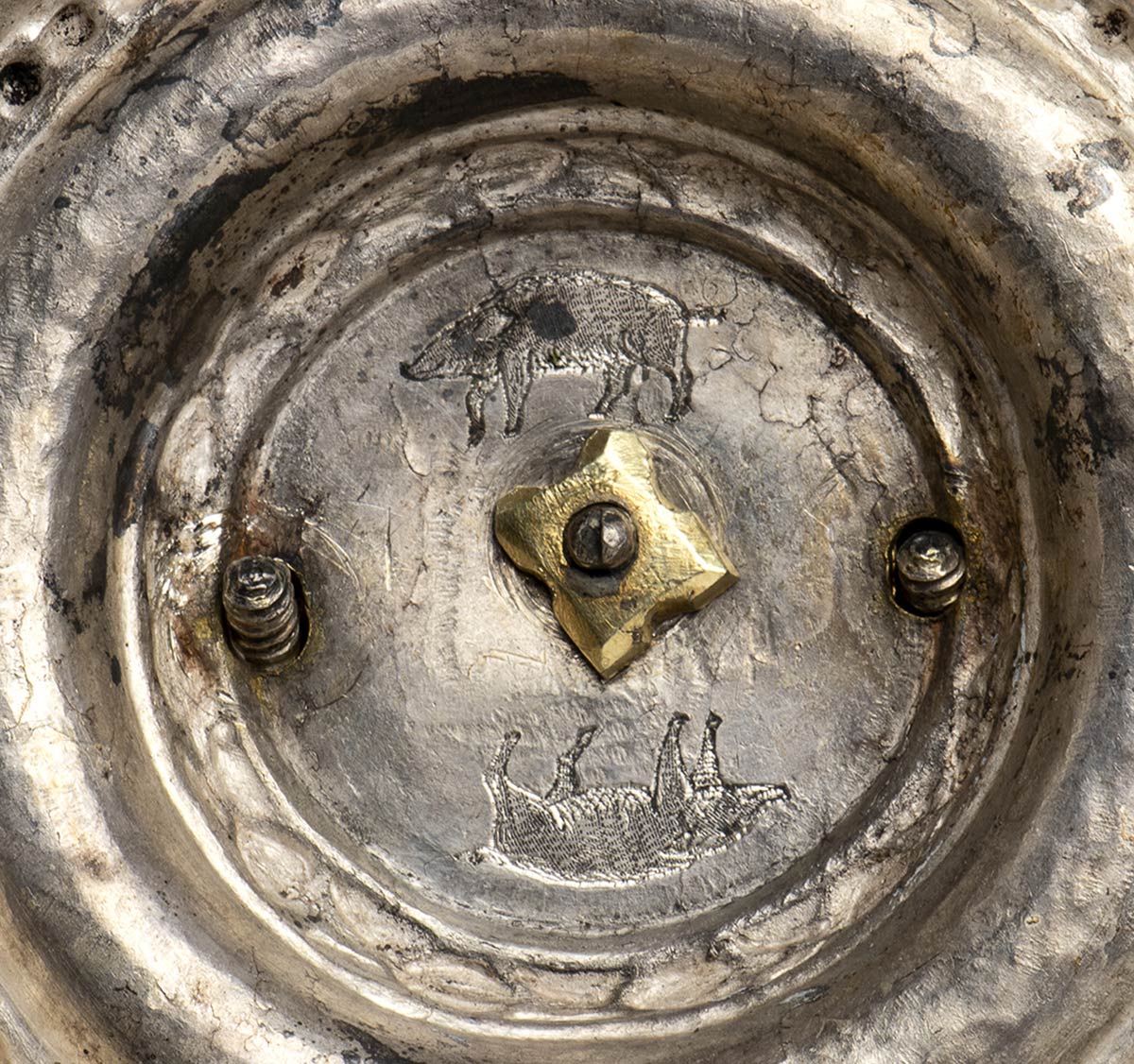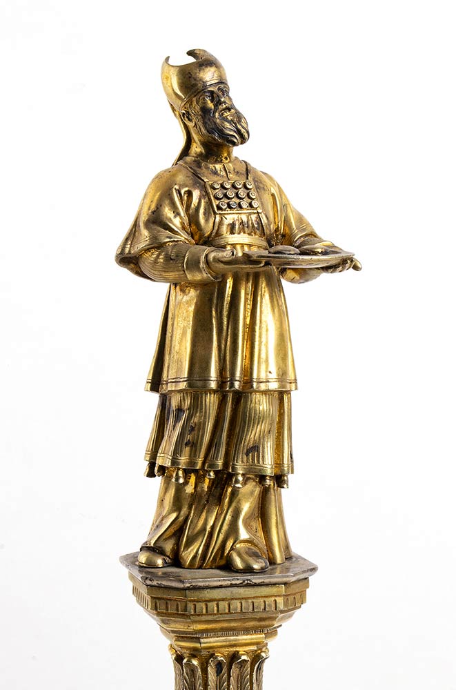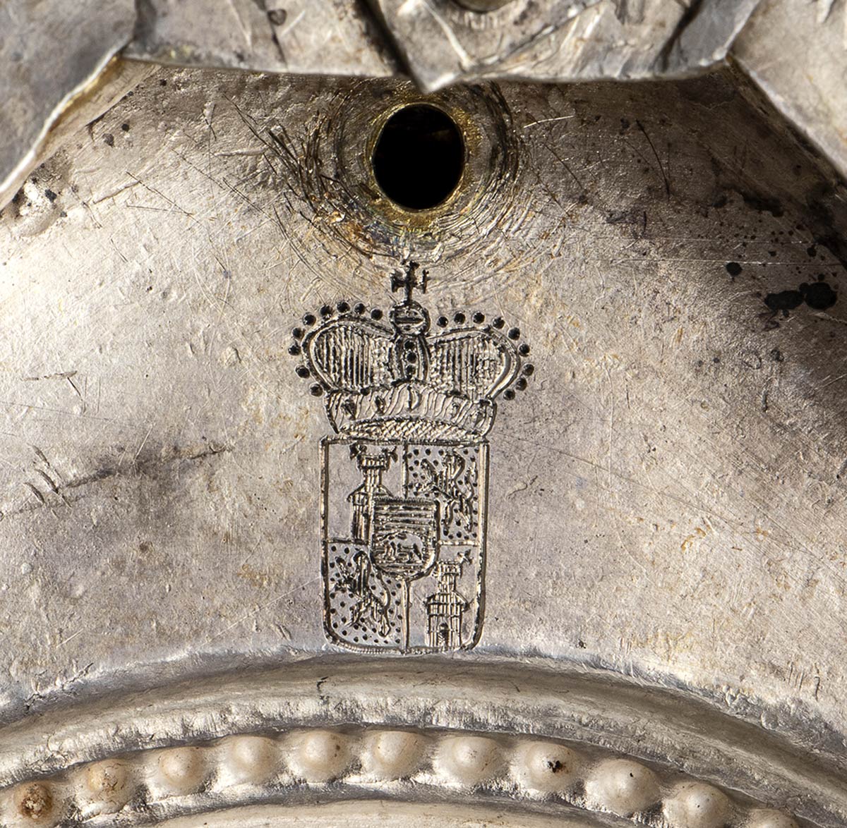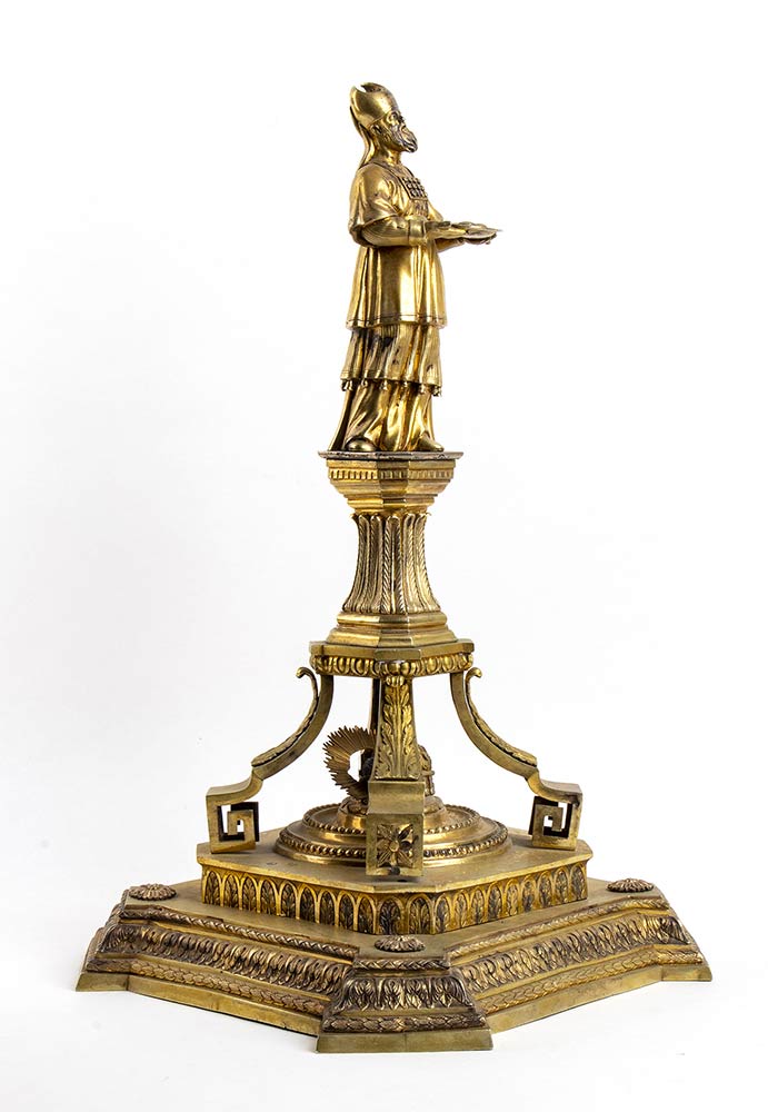 base a sezione quadrata con angoli tronchi, gradinata e decorata con foglie d'alloro, sulla cui sommità è collocato l'agnello per il sacrificio pasquale. Nella parte superiore si erge la figura di Aaron (Aronne), fratello di Mosè, rappresentato con il Pettorale del Giudizio e con il paniere dei pani azzimi. Punzonato con il marchio di garanzia in uso in Sicilia dal 1829 al 1872 rappresentato dalla testa di Cerere di proflo a sinistra accompagnata dal numero arabo "8" per l'argento al titolo di 833/1000, dal marchio di un saggiatore catanese e dal marchio di un argentiere non identificato. Sotto il basamento sono altresi presenti gli stemmi nobiliari della committenza. Altezza 42 cm, larghezza 26 cm. Peso 2580 gr. Stato di conservazione: ***** ottimo.