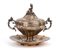 di forma sagomata con piattino en-suite, interamente incisi con decori floreali; manici laterali con poggiadito a testa di putto alato e coperchio con fastigio raffigurante un putto sul dorso di un pesce. Doratura interna al mercurio. Punzonati con il marchio francese per l'argento al titolo di 950/1000 in uso a Parigi dopo il 1838 e con il marchio dell'argentiere Tourquet Alexandre-Auguste operante in Parigi dal 1855 al 1882. Diametro coppa 13,5 cm, con manici 20,3 cm. Altezza coppa 17 cm. Diametro piattino 18,6 cm. Peso 800 gr. Stato di conservazione: **** buono.
