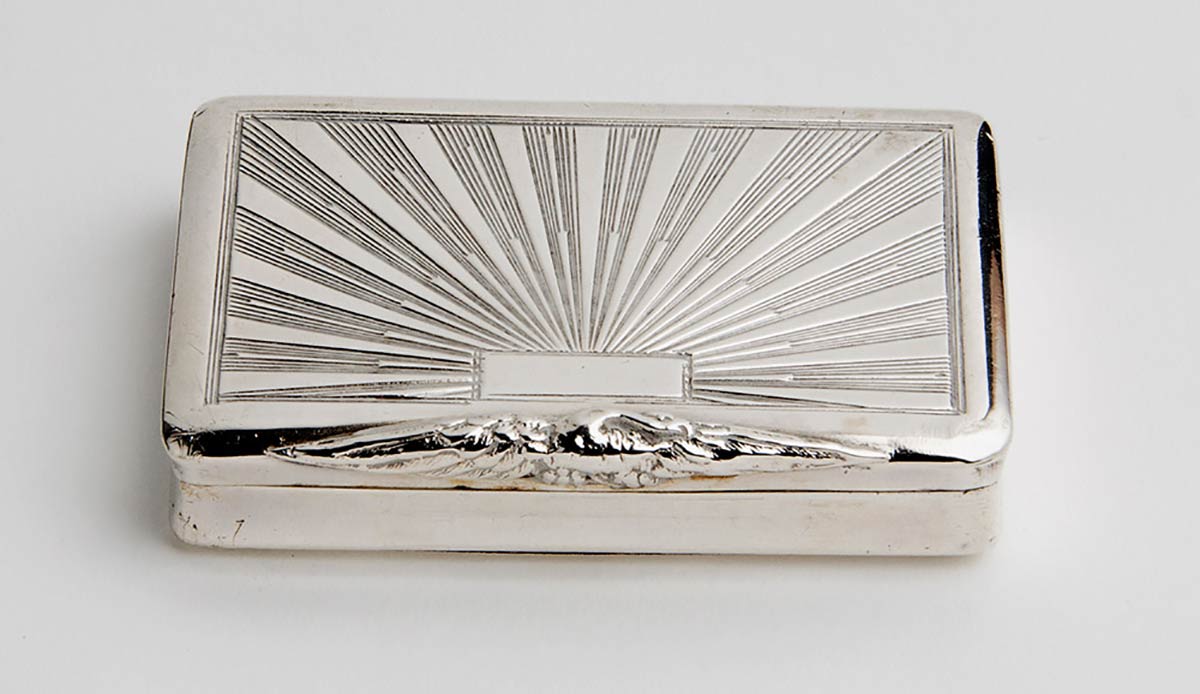 di forma rettangolare con interno dorato. Punzonata argento al titolo di 13 lothighe (812,5/1000) Austria-Ungheria, Vienna 1855. Dimensioni 8,2 x 5,3 x 1,5 cm. Peso 84 gr. Stato di conservazione: **** buono.