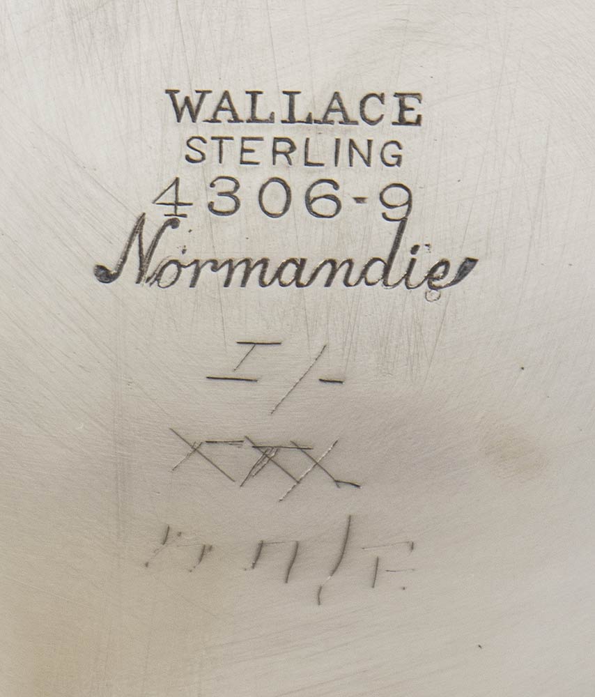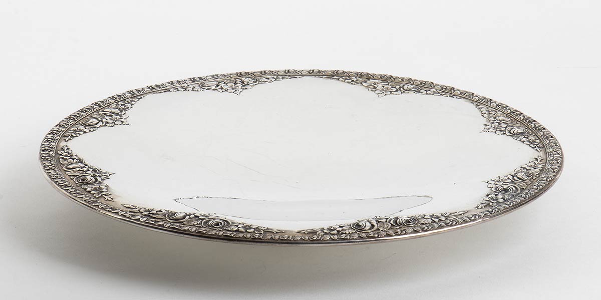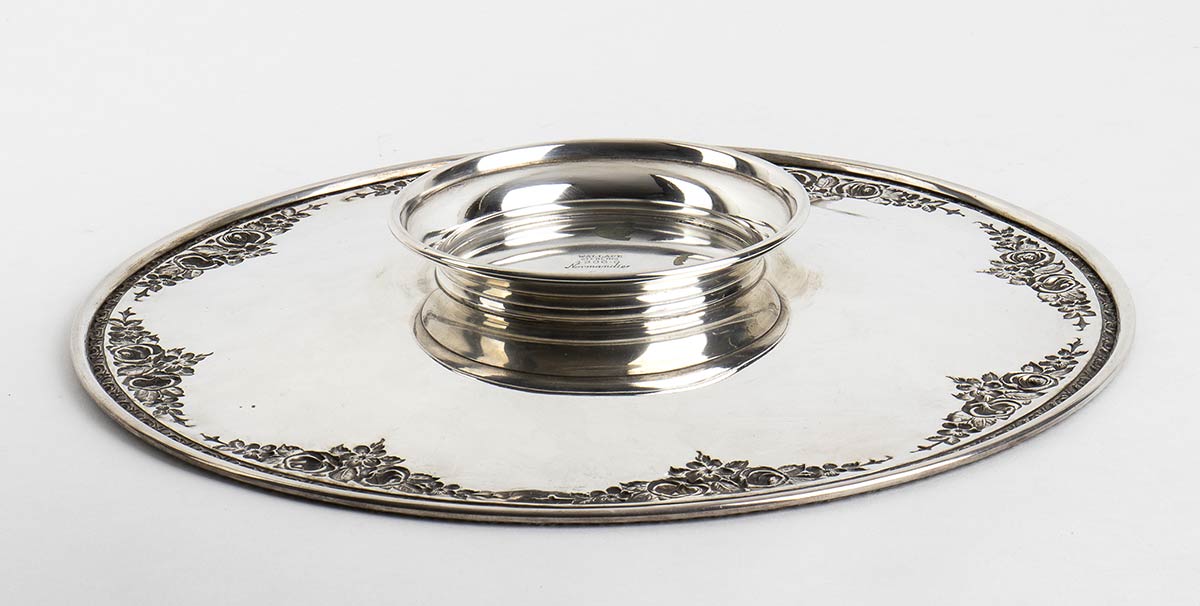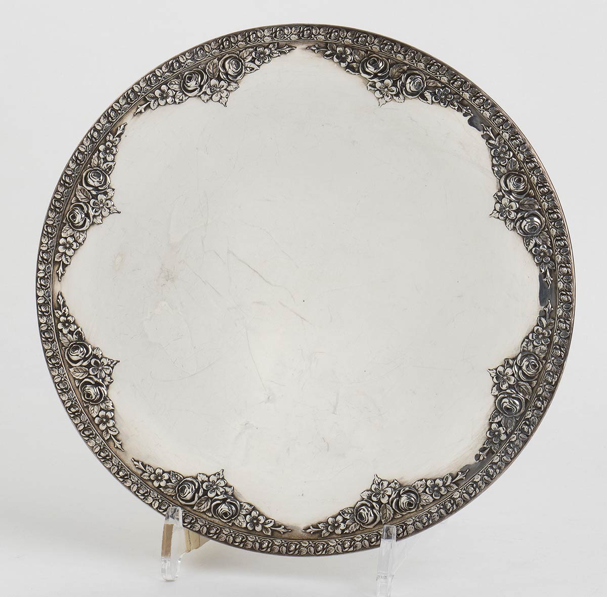 di forma rotonda a decori floreali, poggiante su piede circolare. Punzonato "4306-9 ", "Normandie", argentiere Wallace. Altezza 3 cm, diametro 25,5 cm. Peso 370 gr. Stato di conservazione: **** buono.