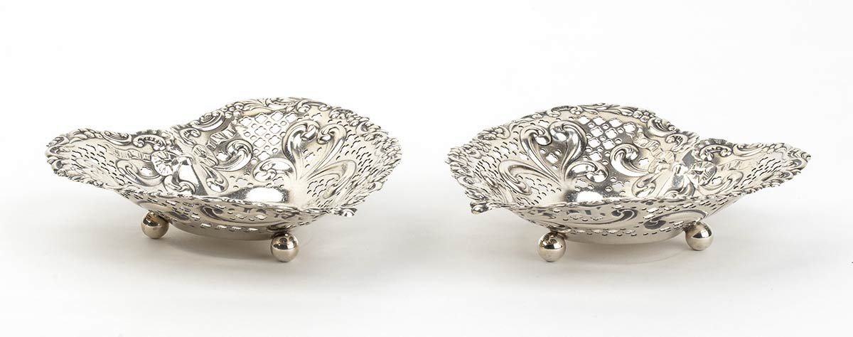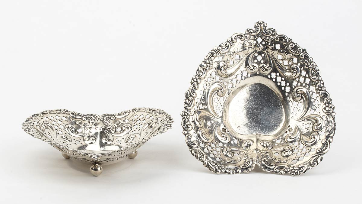 a forma di cuore traforati a motivi geometrici e decorati con volute fogliate. Serie completa di marchi Gorham in uso dopo 1953. Dimensioni 12,5 x 11,5 cm, altezza 3 cm. Peso 144 gr. Stato di conservazione: **** buono.