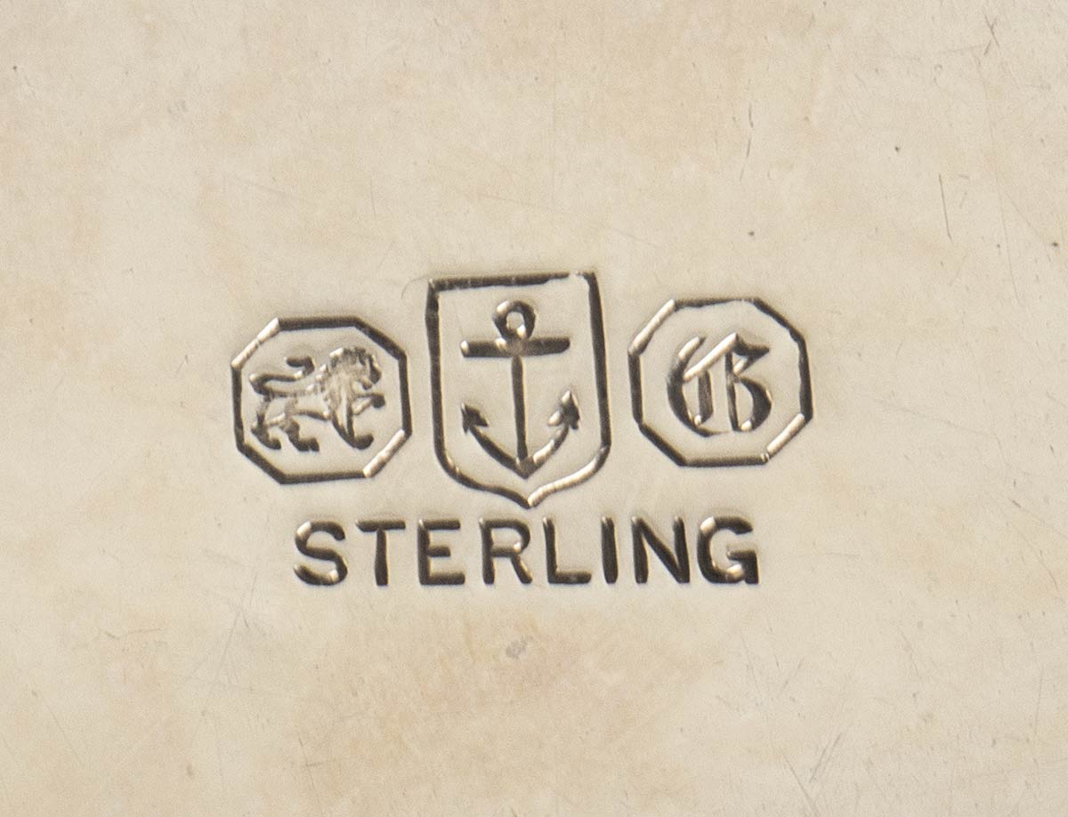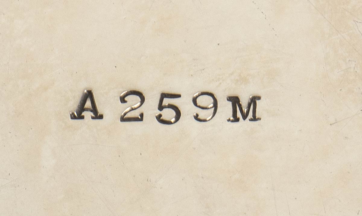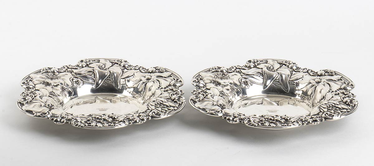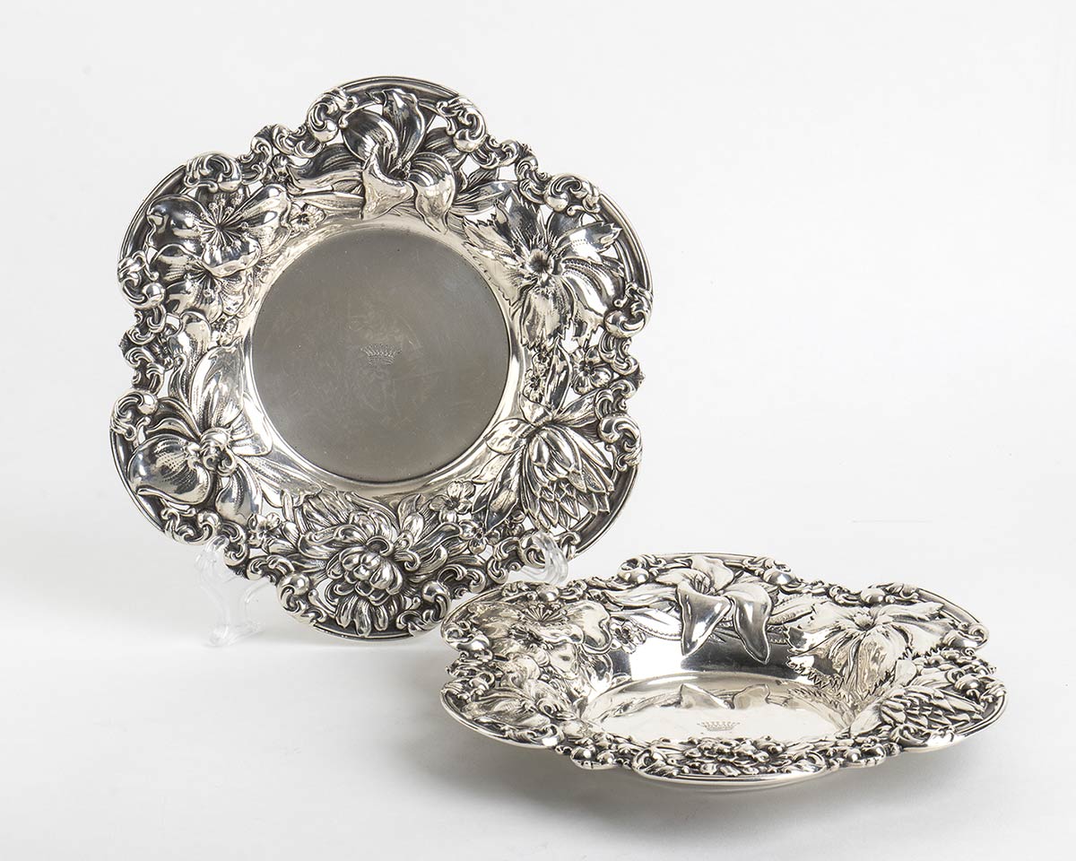 di forma sagomata a decori floreali. Punzonati "Sterling", "A 259 M" e con il marchio dell'argentiere Gorham Manufacturing Co. Altezza 2,5 cm, diametro 20 cm. Peso totale 360 gr. Stato di conservazione: **** buono.