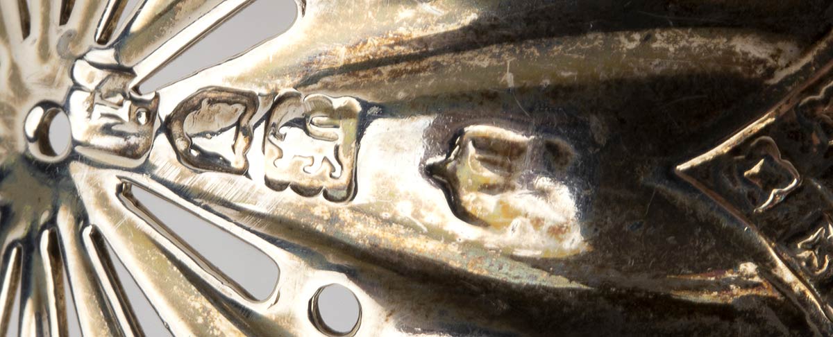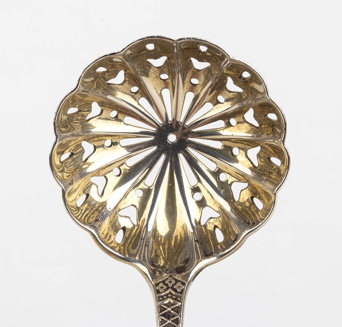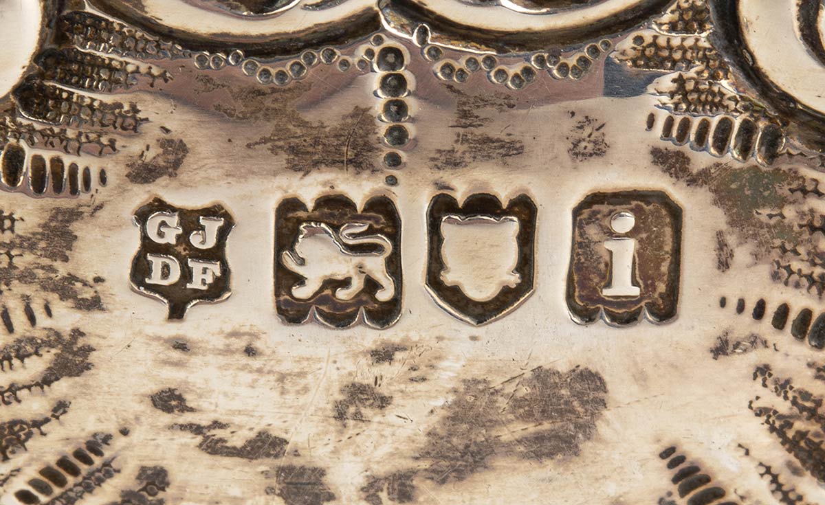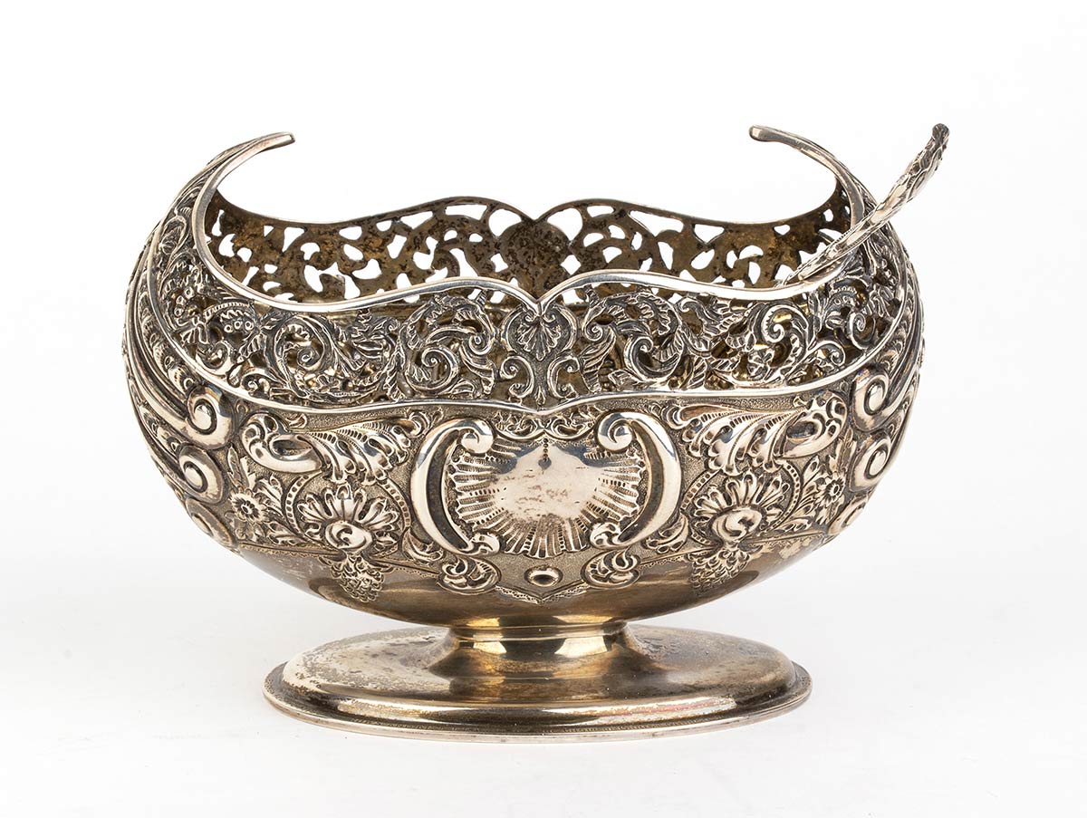 a doppio casco sbalzata e cesellata con decorazioni floreali. Cucchiaino en-suite. Serie completa di marchi Londra 1904-1905, argentieri Josiah Williams & Co (George Maudsley Jackson & David Landsborough Fullerton). Dimensioni 15,5 x 9 cm, altezza 11 cm. Peso 298 gr. Stato di conservazione: **** buono.