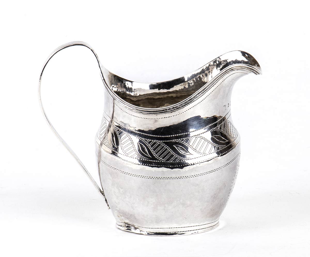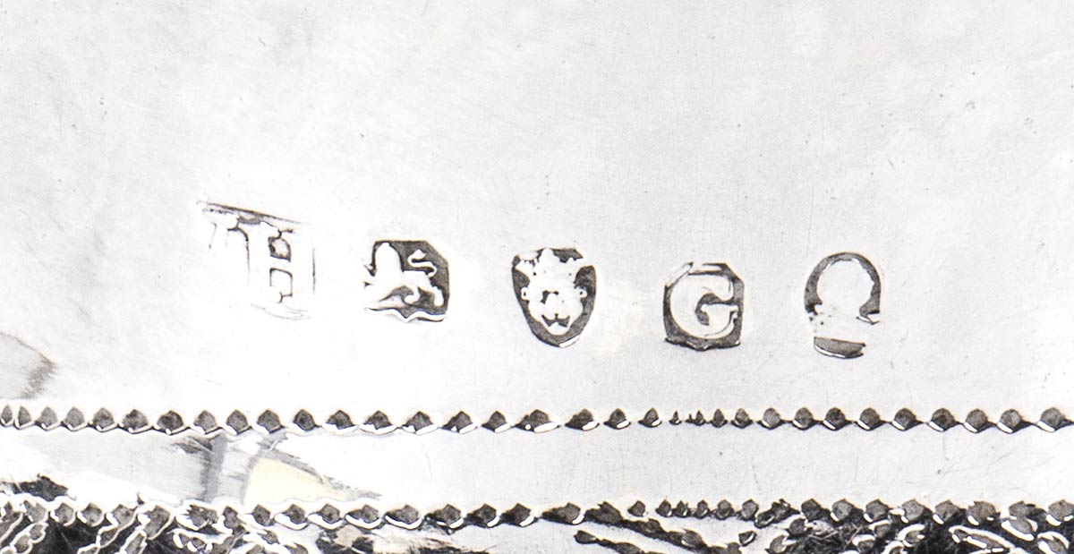 di forma ovale con incisioni a taglio luce, poggiante su base piatta. Serie completa di marchi Londra 1802-1803. Altezza 10 cm, larghezza massima 12 cm. Peso 91 gr. Stato di conservazione: **** buono. (Jackson’s p. 59)