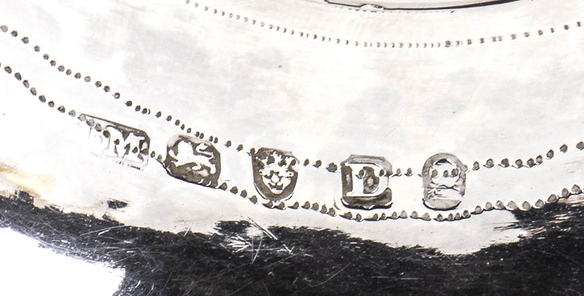 di forma ovale con incisioni a taglio luce, poggiante su base piatta. Serie completa di marchi Londra 1799-1800. Altezza 11,5 cm, larghezza massima 9,5 cm. Peso 93 gr. Stato di conservazione: **** buono. (Jackson’s p. 59)