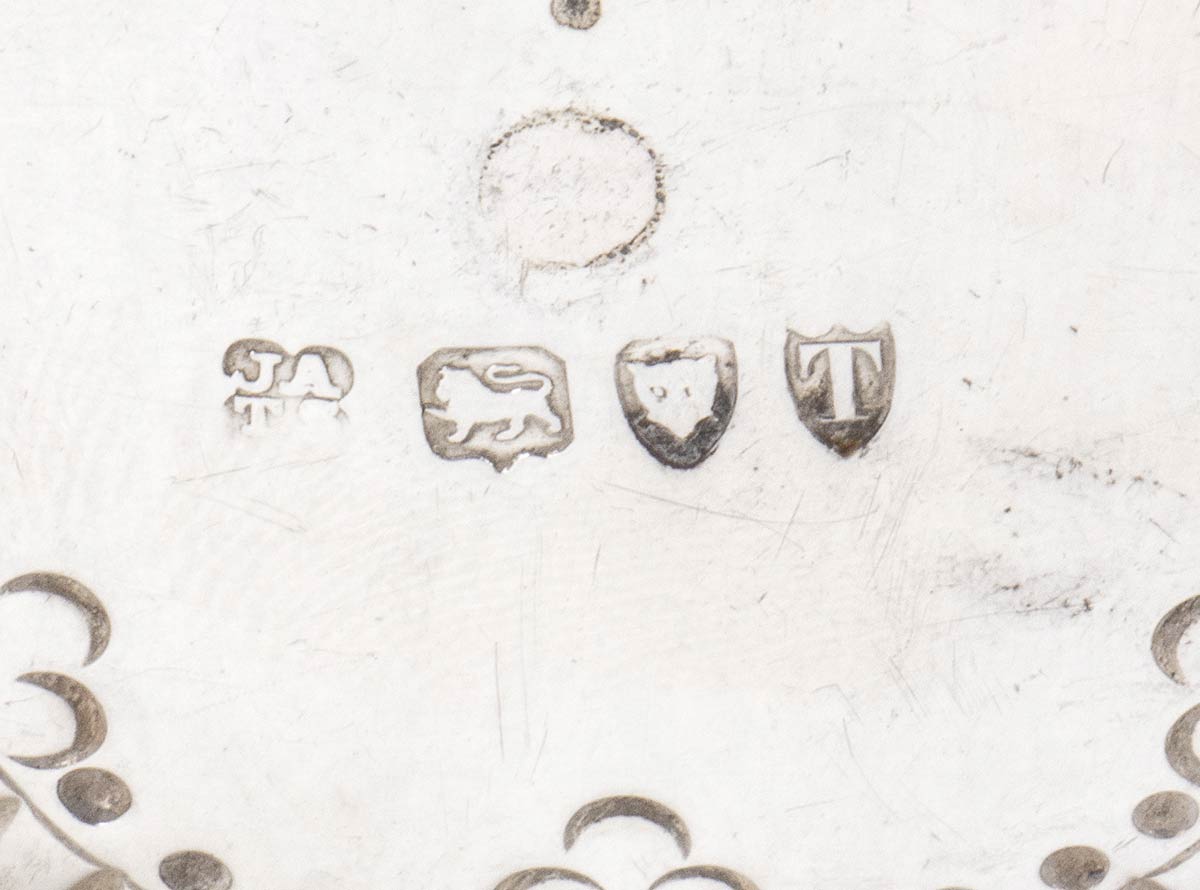 di forma rotonda con presa laterale. Serie completa di marchi Londra 1894-1895. Altezza 9 cm, diametro 13 cm. Peso 204 gr. Stato di conservazione: ***** eccellente.