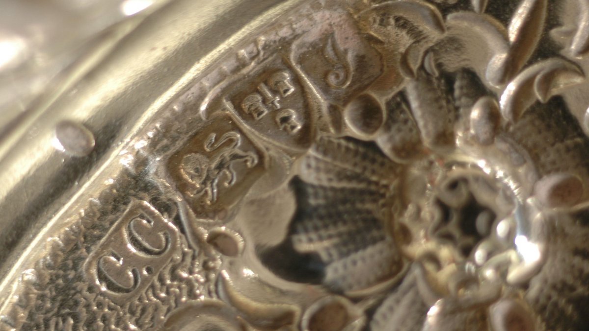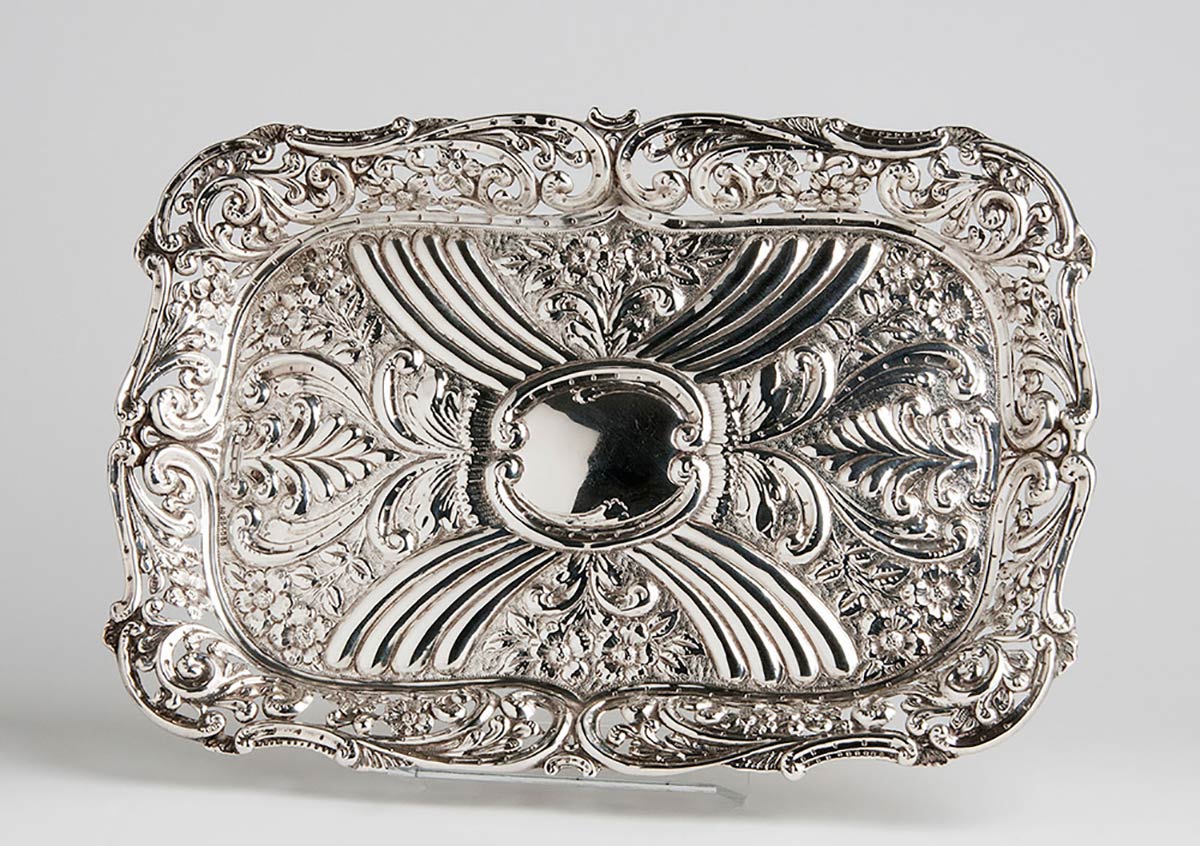 di forma rettangolare, sbalzato e cesellato con decori floreali. Serie completa di marchi Chester 1906-1907, argentiere Colen Hewer Cheshire. Dimensioni 31 x 21,5 x 2 cm. Peso 360 gr. Stato di conservazione: ***** eccellente.