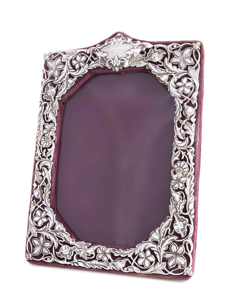 decorata con volute floreali e fiori. Serie completa di marchi Birmingham 1907-1908, argentiere Henry Matthews. Dimensioni esterne 24,5 x 17,3 cm, interne 17 x 12 cm. Stato di conservazione: ***** eccellente. (Jackson's p.360; Jones p. 344)