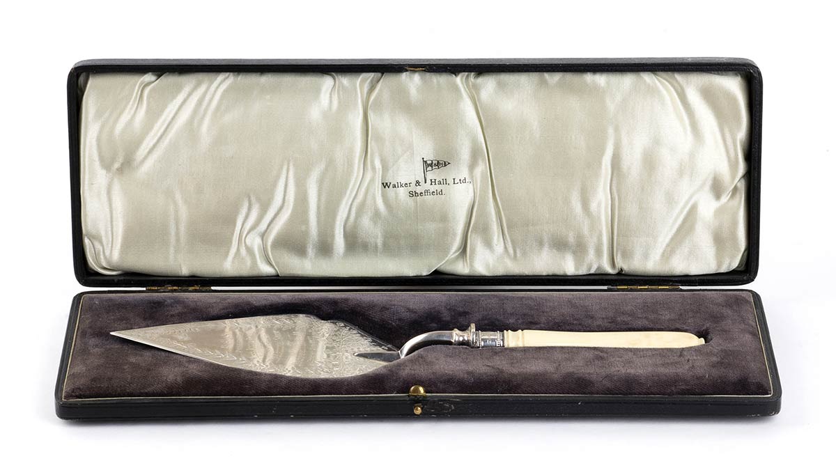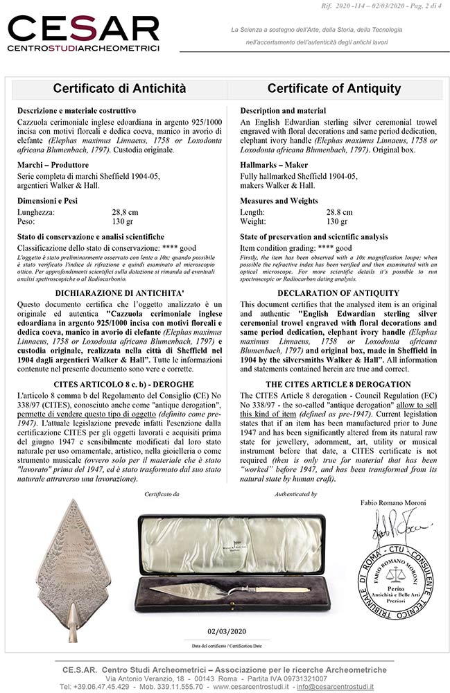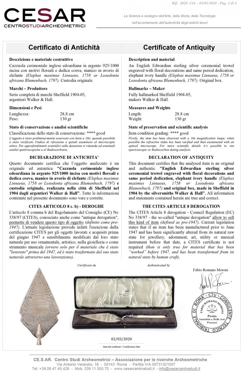 incisa con motivi floreali e dedica coeva, manico in avorio di elefante (Elephas maximus Linnaeus, 1758 or Loxodonta africana Blumenbach, 1797). Serie completa di marchi Sheffield 1904-05, argentieri Walker & Hall. Lunghezza 28,8 cm. Peso 130 gr. Stato di conservazione: ***** ottimo. Custodia originale. Accompagnato da certificato di antichità Ce.S.Ar. Centro Studi Archeometrici (pre-1947). (Ref: Jackson's p. 432; Culme vol. 1. p. 463, Culme vol. 2. p.318) uesto lotto contiene avorio/corallo/tartaruga o altre specie protette dalla regolamentazione CITES (the Convention on International Trade in Endangered Species of Wild Fauna and Flora). A causa dei recenti cambiamenti nella legislazione di molti paesi (ad es. USA o Cina) sulle specie in via di estinzione tra cui corallo, avorio e tartaruga - BFA raccomanda agli acquirenti di verificare con il proprio governo eventuali requisiti di importazione prima di effettuare un'offerta. Ad esempio, le normative statunitensi limitano l'importazione di avorio di elefante; BFA non assisterà quindi gli acquirenti nella spedizione di questo lotto negli Stati Uniti. Chi fosse interessato è pregato di mettersi in contatto con i nostri uffici prima dell'asta CITES ARTICOLO 8 c. b) – DEROGHE L'articolo 8 comma b del Regolamento del Consiglio (CE) No 338/97 (CITES), conosciuto anche come ""antique derogation"", permette di vendere questo tipo di oggetto (definito come pre-1947). L'attuale legislazione prevede infatti l'esenzione dalla certificazione CITES per gli oggetti lavorati e acquisiti prima del giugno 1947 e sensibilmente modificati dal loro stato naturale per uso ornamentale, artistico, nella gioielleria o come strumento musicale (ovvero solo per il materiale che è stato ""lavorato"" prima del 1947, ed è stato trasformato dal suo stato naturale attraverso una lavorazione). Il certificato gemmologico è disponibile a pagamento dopo l'asta