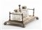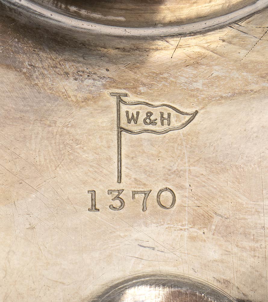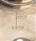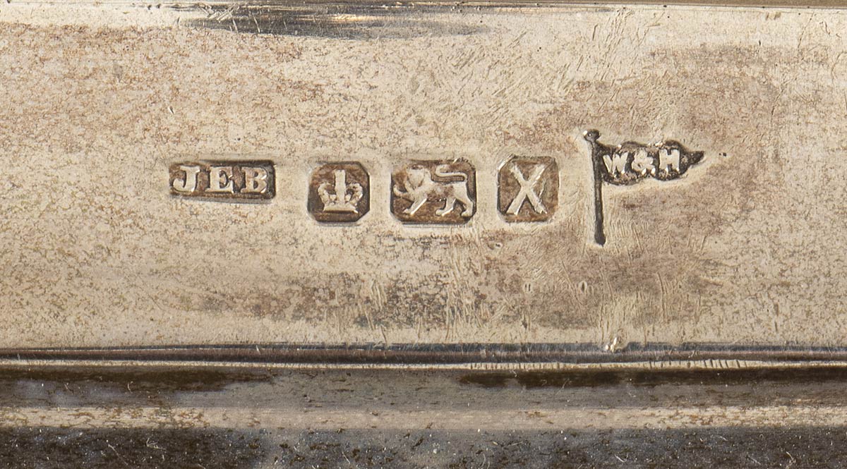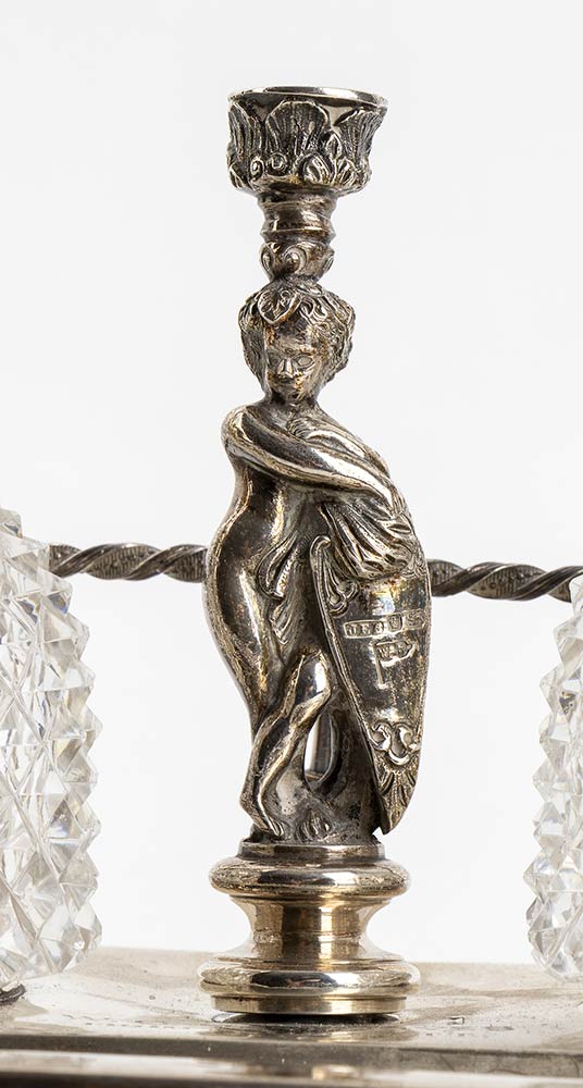 di forma rettangolare poggiante su quattro piedini sferici, portacandela centrale affiancato da due ampolle in vetro molato. Serie completa di marchi Sheffield 1890-1891, argentieri Walker & Hall (John Edward Bingham). Dimensioni 26,5 x 17 cm, altezza 13 cm. Peso lordo 1540 gr, peso netto 900 gr. Stato di conservazione: **** buono.