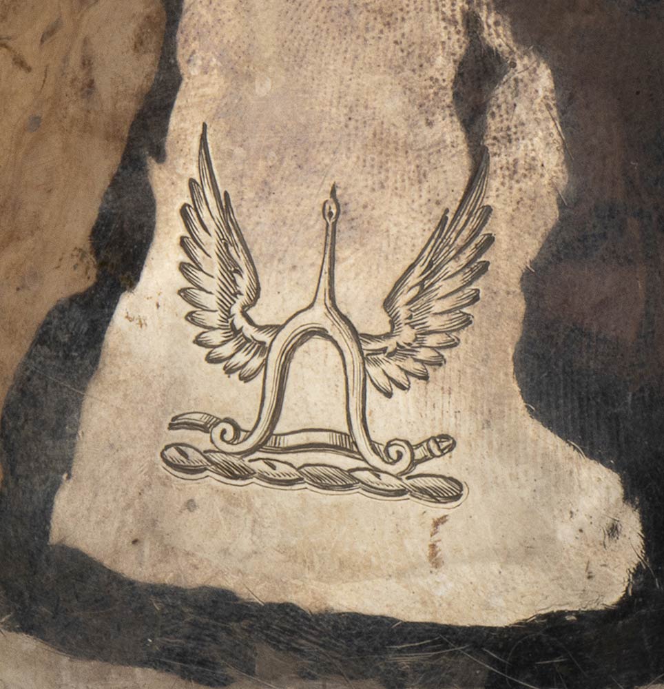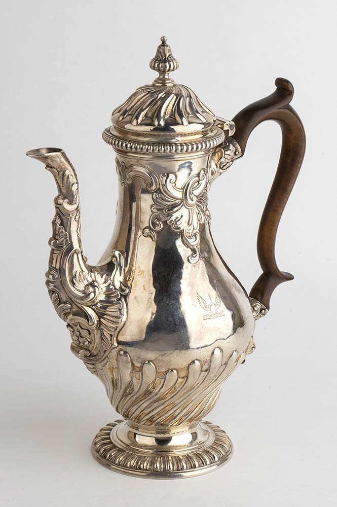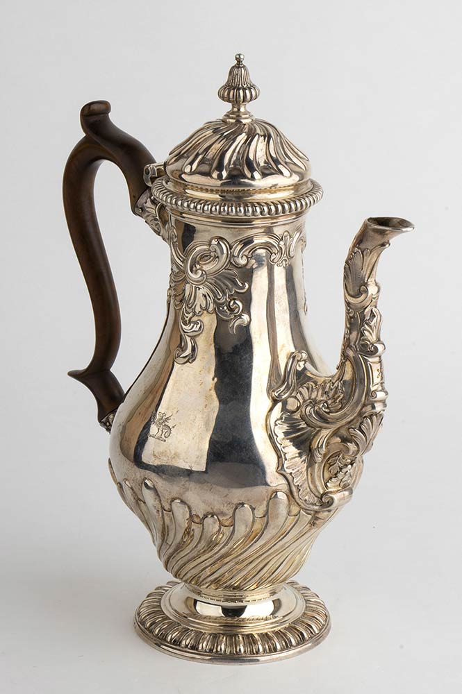 corpo piriforme poggiante su piede circolare con decorazione foliate a spirale scanalata e beccuccio fuso decorato con decorazioni floreali. Il coperchio incernierato con decorazioni similari e bordo godronato con fastigio fuso. Manico coevo in legno da frutto. Serie completa di marchi Londra 1760-61, argentiere Samuel Courtauld. Altezza 29,5 cm, diametro piede 9,8 cm. Peso 971 gr. Stato di conservazione: **** buono.