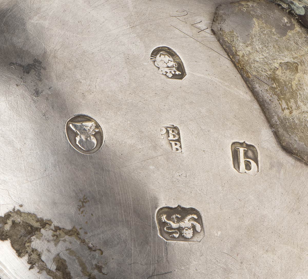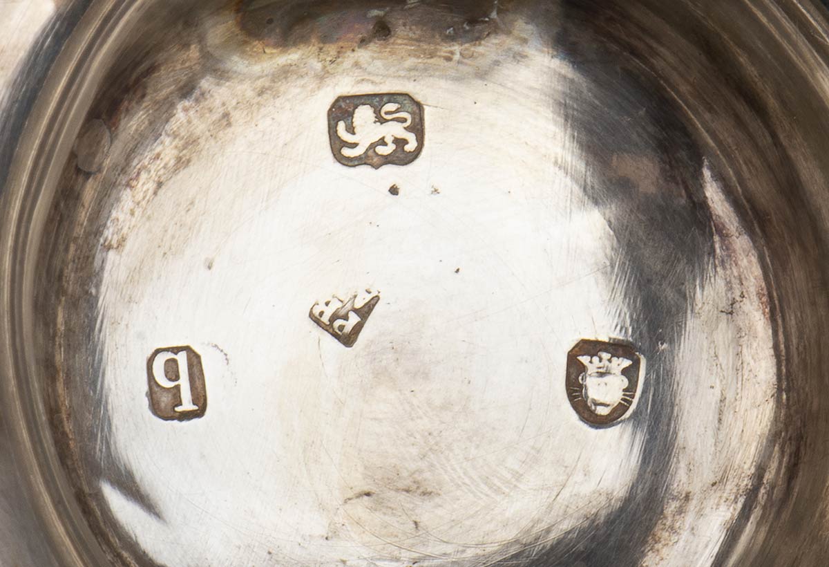 corpo a balaustro liscio con coperchio duomato, poggiadito traforato, manico a voluta con terminale a cuore. Serie completa di marchi Londra 1791-92, argentieri Peter & Ann Bateman. Diametro piede 11 cm, altezza 20,5 cm. Peso 735 gr. Stato di conservazione: **** buono.