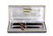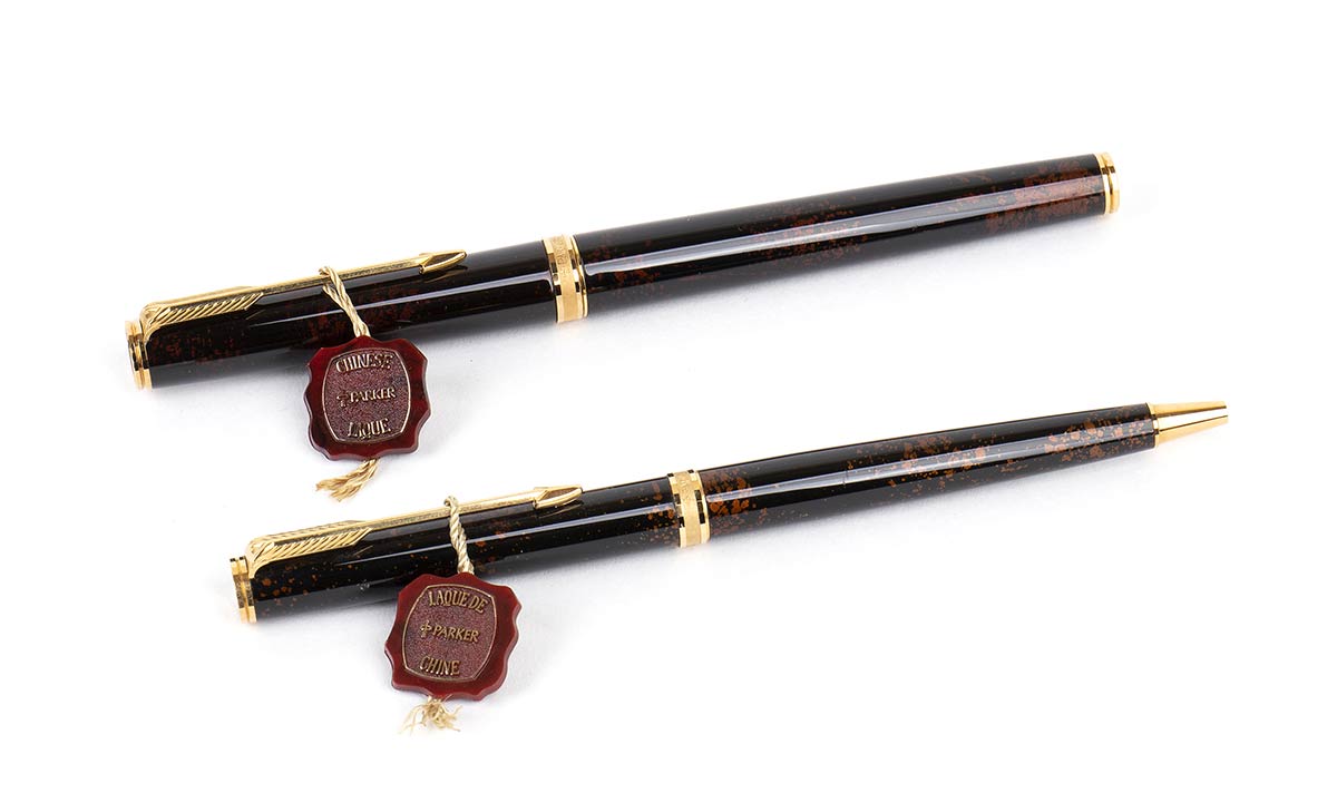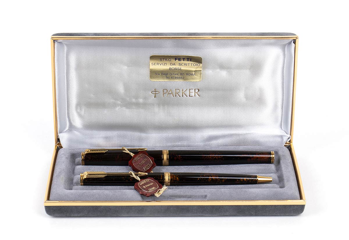 corpo e cappuccio con finiture dorate, penna stilografica con pennino in oro 18k riportante la dicitura "Parker 750m France 18K". Cappuccio firmato "Parker France". Lunghezza penna stilografica 13,7 cm, lunghezza penna 13 cm. Stato di conservazione: ***** eccellente, con sigilli originali. Mai usate. Scatola e controscatola originale Parker.