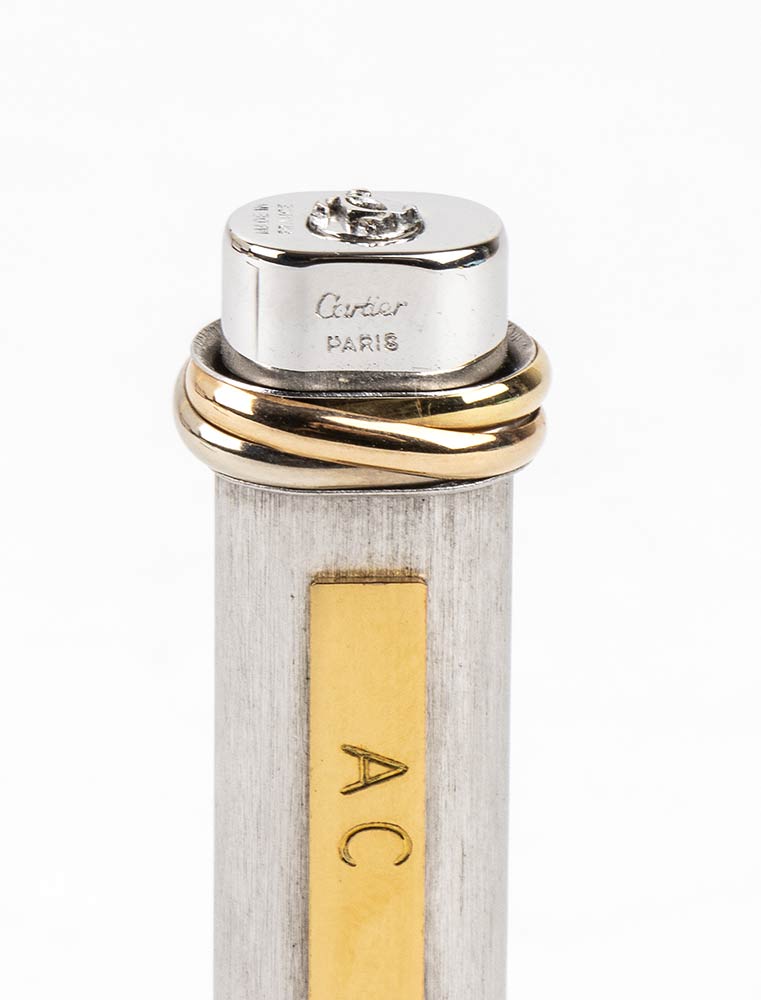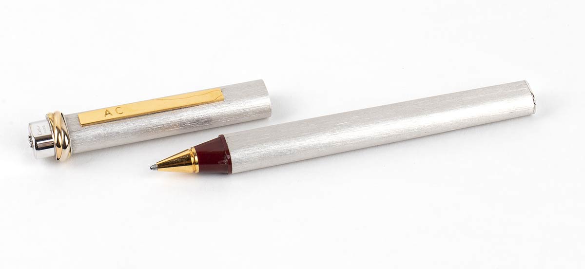corpo e cappuccio argentati; premendo la parte superiore del cappuccio la clip si apre alla larghezza desiderata e rilasciando la pressione la clip ritorna nella sua posizione originale. Incisione "AC" sulla clip. Numero di serie 576148. Lunghezza 13,5 cm. Stato di conservazione: **** buono. Scatola Cartier originale.