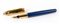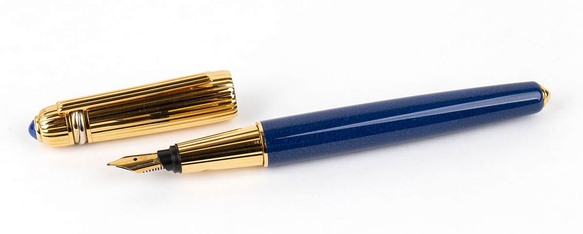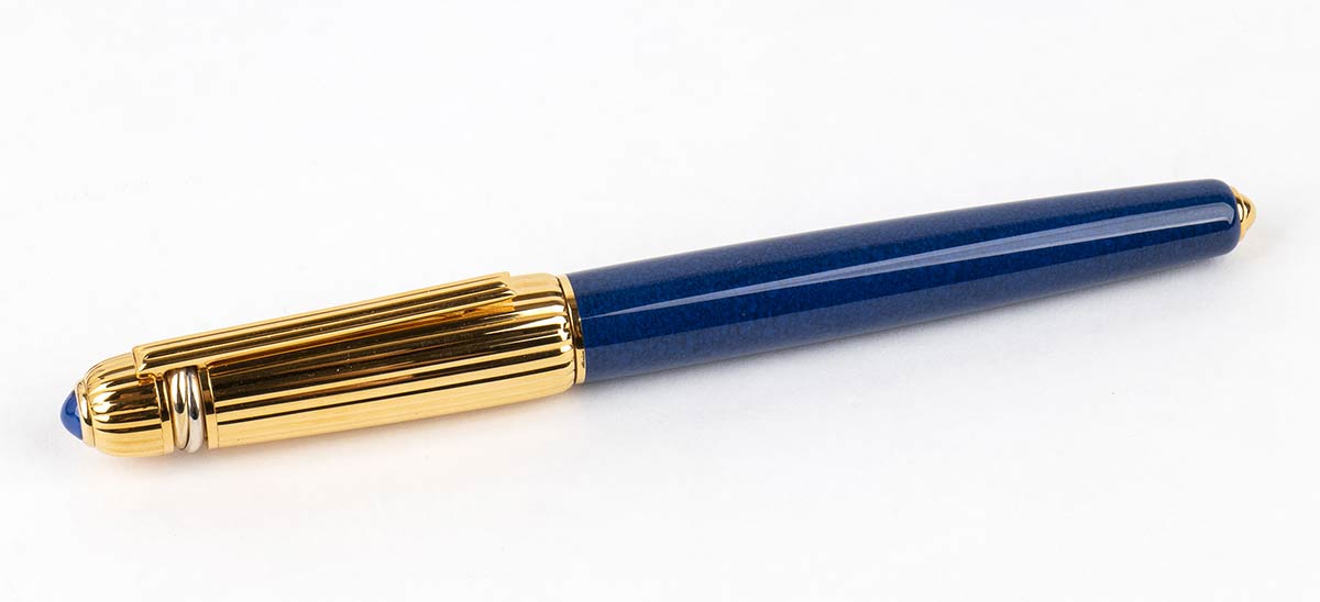 metallo dorato e lacca blu con cappuccio godronato, pennino in oro 18k riportante la dicitura "18K 750" e logo Cartier. In perfette condizioni. Cappuccio firmato "Pasha de Cartier". Stato di conservazione: ***** eccellente. Mai usata. Scatola e controscatola originali Cartier.