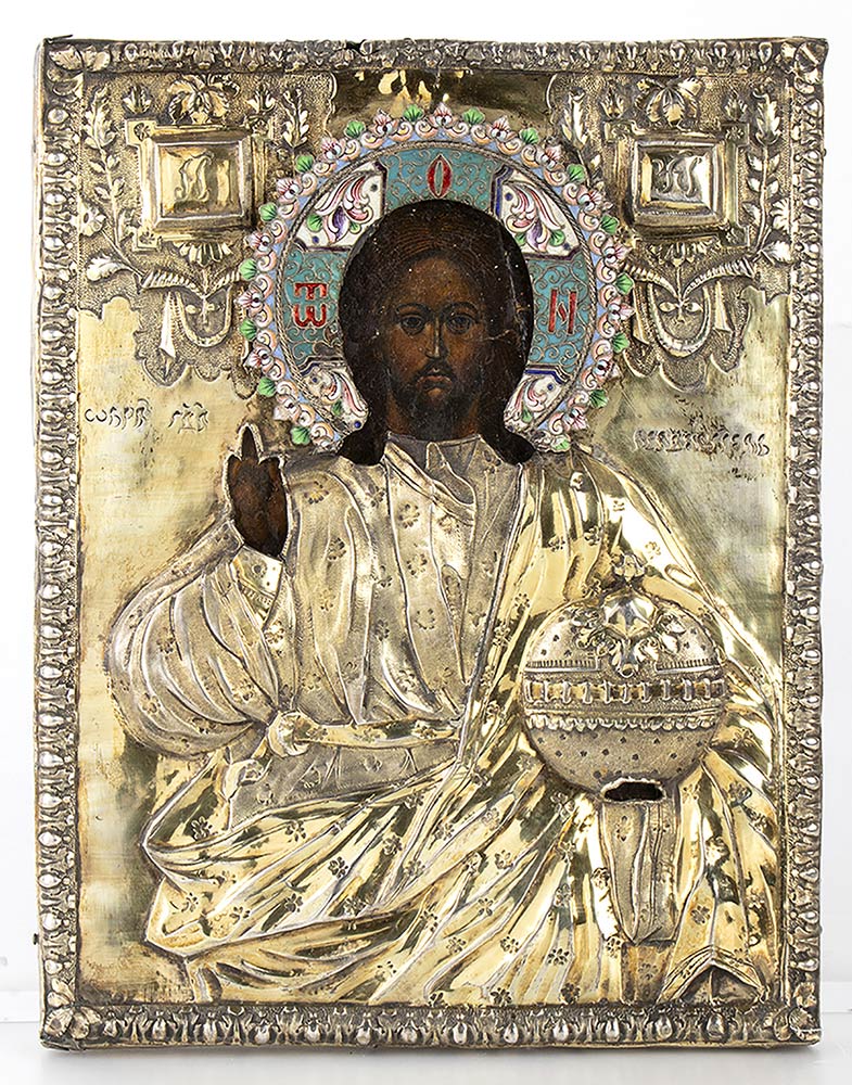 tempera su tavola con riza in argento dorato e smalti, raffigurante "Cristo con il Globo". Serie completa di marchi per l'argento al titolo di 84 zolotniks (875/1000) in uso a Mosca nel 1805, assaggiatore Mikhail Mikhailovich Karpinsky, marchio dell'argentiere in cirillico non identificato (Rif. Postnikova-Loseva p. 205 nr 2099). Dimensioni 24 x 19 x 2 cm. Peso 650 gr. Stato di conservazione: **** buono (minori difetti alla parte esterna della riza).