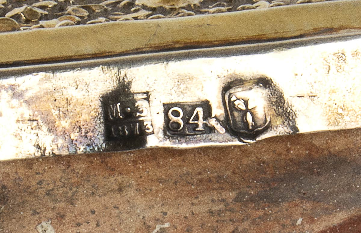 tempera su tavola con riza in argento dorato, raffigurante "Madonna del Deesis". Serie completa di marchi per l'argento al titolo di 84 zolotniks (875/1000) in uso a Saratov nel 1873, assaggiatore Zahrov M. (Rif. Postnikova-Loseva p. 243 nr 3403). Dimensioni 27,2 x 2,8 cm, altezza 31 cm. Peso 1480 gr. Stato di conservazione: **** buono (piccola mancanca nella parte superiore).