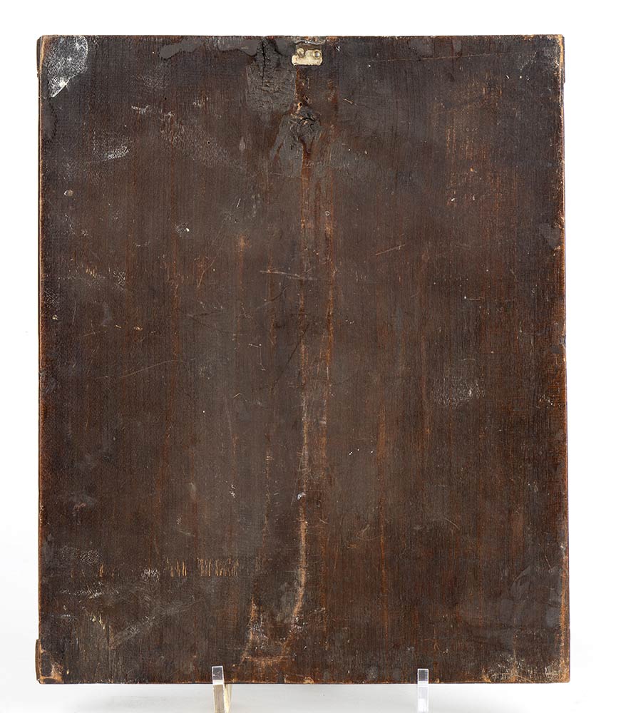 tempera su tavola con riza in argento, raffigurante "Icona di famiglia". Serie completa di marchi per l'argento al titolo di 84 zolotniks (875/1000) in uso a Pskov nel 1857, assaggiatore Izjurov Dmitriy (Rif. Postnikova-Loseva p. 239 nr 3253), argentiere "I P". Dimensioni 31 x 26 x 2,8 cm. Stato di conservazione: **** buono.