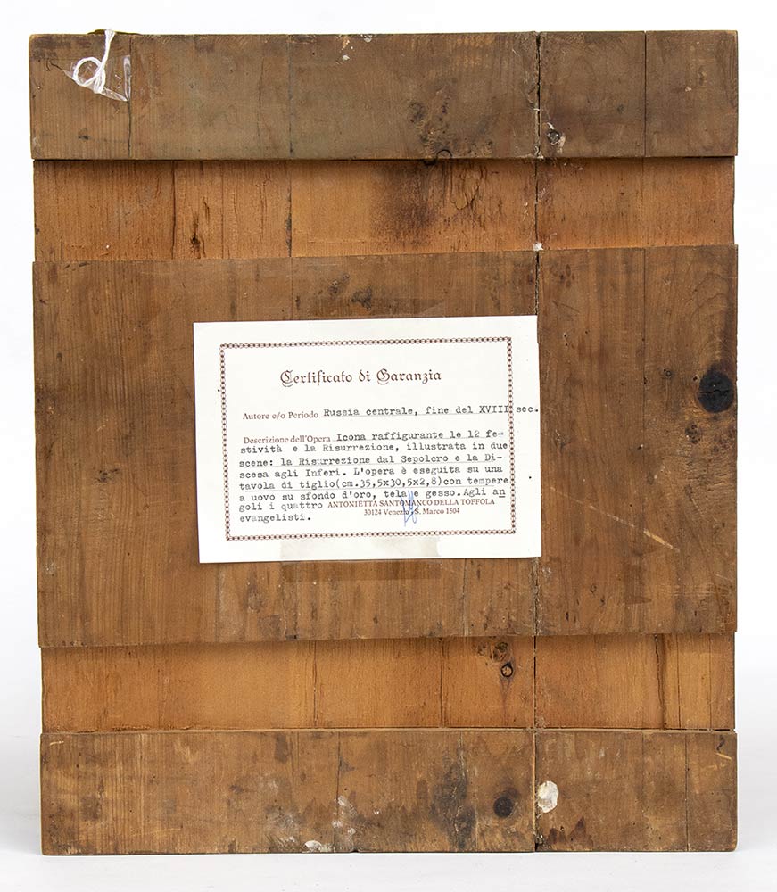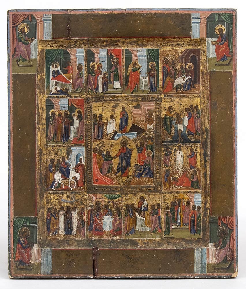 tempera su tavola, raffigurante le "Dodici Grandi Feste" dell'anno liturgico" Dimensioni 35.5 x 30 cm. Stato di conservazione: **** buono.