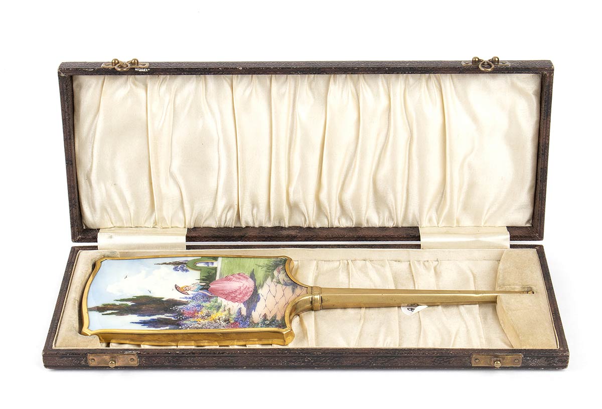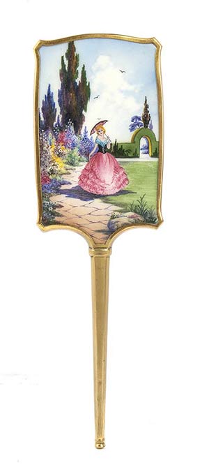 con smalti raffigurante una figura femminile in un giardino. Dimensioni 29 x 9 cm. Custodia originale. Stato di conservazione: **** buono.