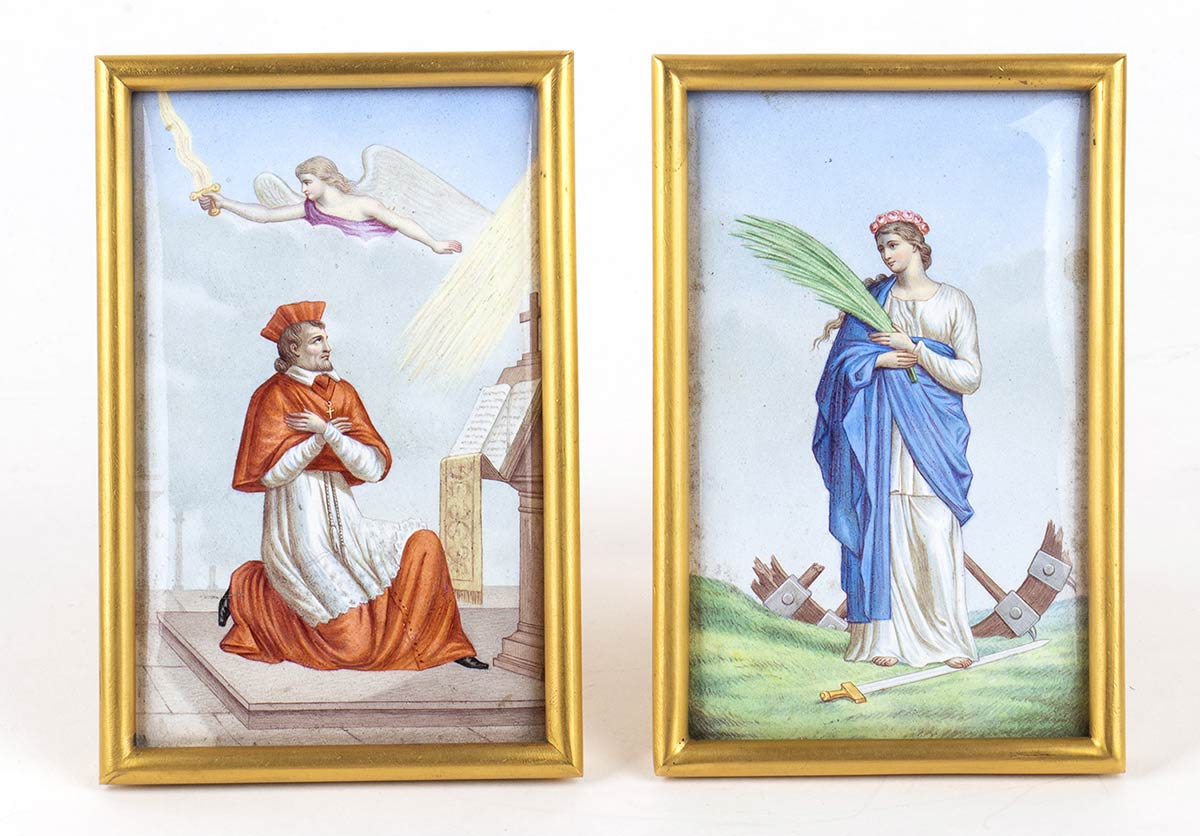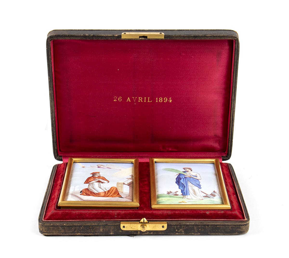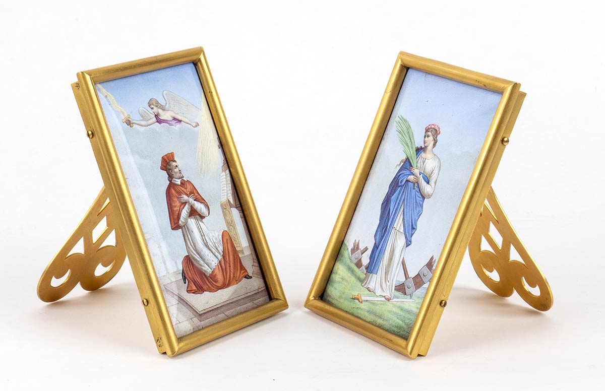 di forma rettangolare, con smalti raffiguranti Santa Caterina d'Alessandria e un altro santo. Dimensioni 12,6 x 8,4 cm. Custodia originale con iscrizione "26 Avril 1894". Stato di conservazione: ***** ottimo.