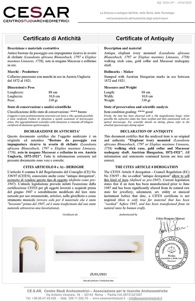 impugnatura ricurva in avorio di elefante (Loxodonta africana Blumenbach, 1797 o Elephas maximus Linnaeus, 1758).Asta in mogano Macassar, collarino in oro punzonato con marchi in uso in Austria Ungheria dal 1872 al 1921. Lunghezza 88 cm, larghezza 10,8 cm. Peso 330 gr. Stato di conservazione: **** buono. Accompagnato da certificato di antichità Ce.S.Ar. Centro Studi Archeometrici (pre-1947). uesto lotto contiene avorio/corallo/tartaruga o altre specie protette dalla regolamentazione CITES (the Convention on International Trade in Endangered Species of Wild Fauna and Flora). A causa dei recenti cambiamenti nella legislazione di molti paesi (ad es. USA o Cina) sulle specie in via di estinzione tra cui corallo, avorio e tartaruga - BFA raccomanda agli acquirenti di verificare con il proprio governo eventuali requisiti di importazione prima di effettuare un'offerta. Ad esempio, le normative statunitensi limitano l'importazione di avorio di elefante; BFA non assisterà quindi gli acquirenti nella spedizione di questo lotto negli Stati Uniti. Chi fosse interessato è pregato di mettersi in contatto con i nostri uffici prima dell'asta CITES ARTICOLO 8 c. b) – DEROGHE L'articolo 8 comma b del Regolamento del Consiglio (CE) No 338/97 (CITES), conosciuto anche come ""antique derogation"", permette di vendere questo tipo di oggetto (definito come pre-1947). L'attuale legislazione prevede infatti l'esenzione dalla certificazione CITES per gli oggetti lavorati e acquisiti prima del giugno 1947 e sensibilmente modificati dal loro stato naturale per uso ornamentale, artistico, nella gioielleria o come strumento musicale (ovvero solo per il materiale che è stato ""lavorato"" prima del 1947, ed è stato trasformato dal suo stato naturale attraverso una lavorazione). Il certificato gemmologico è disponibile a pagamento dopo l'asta
