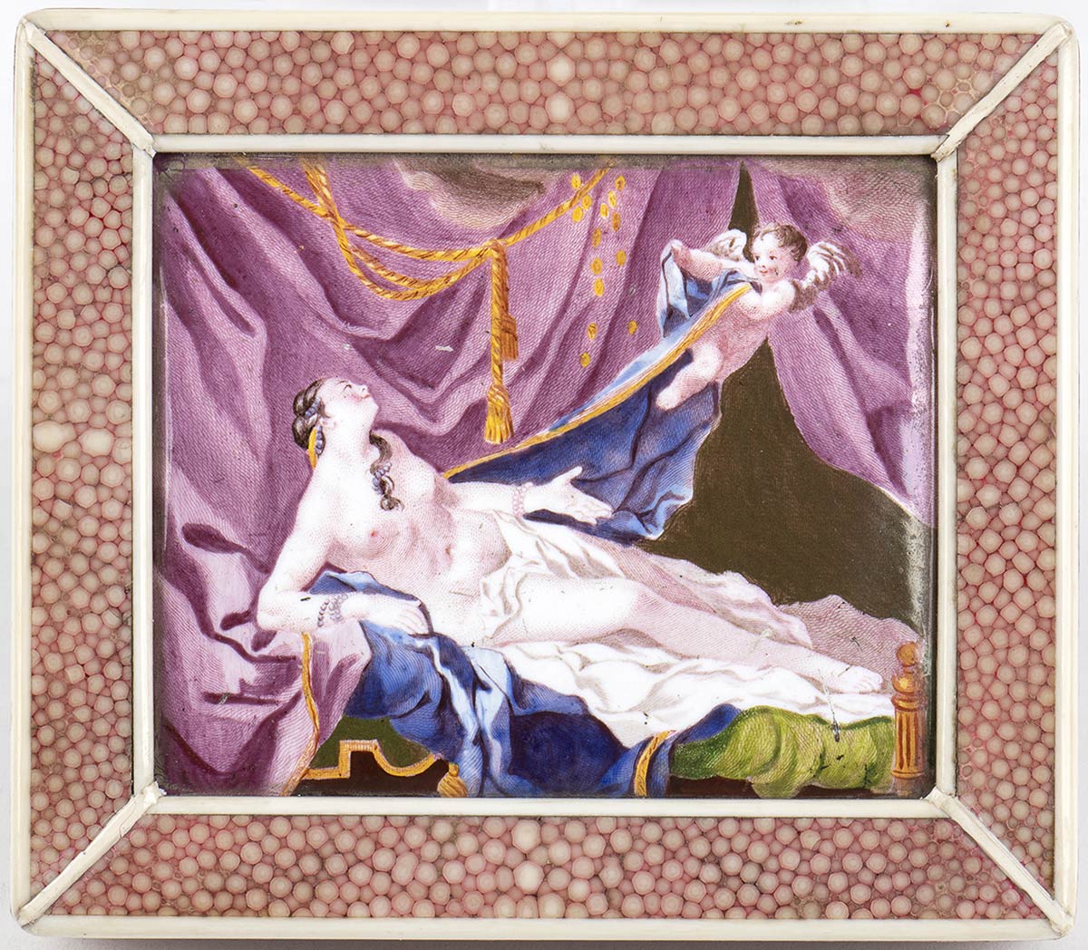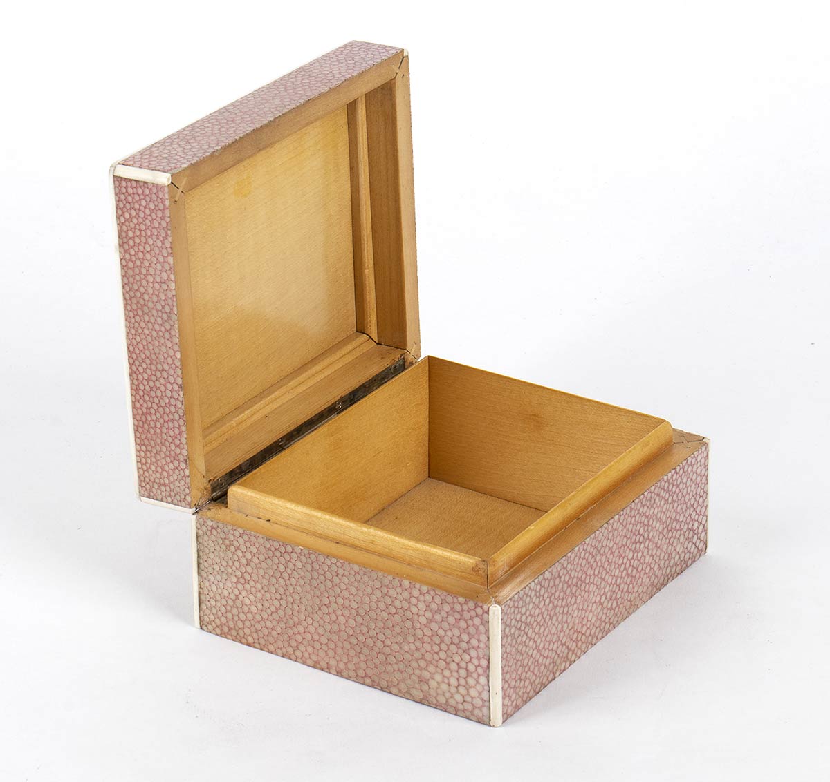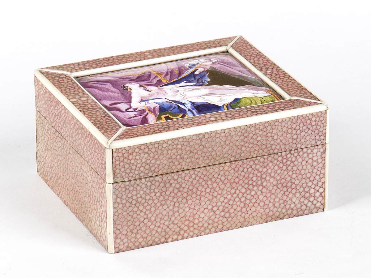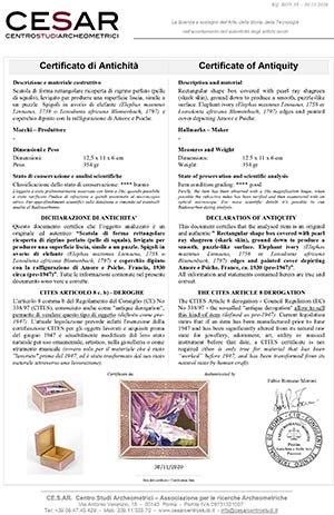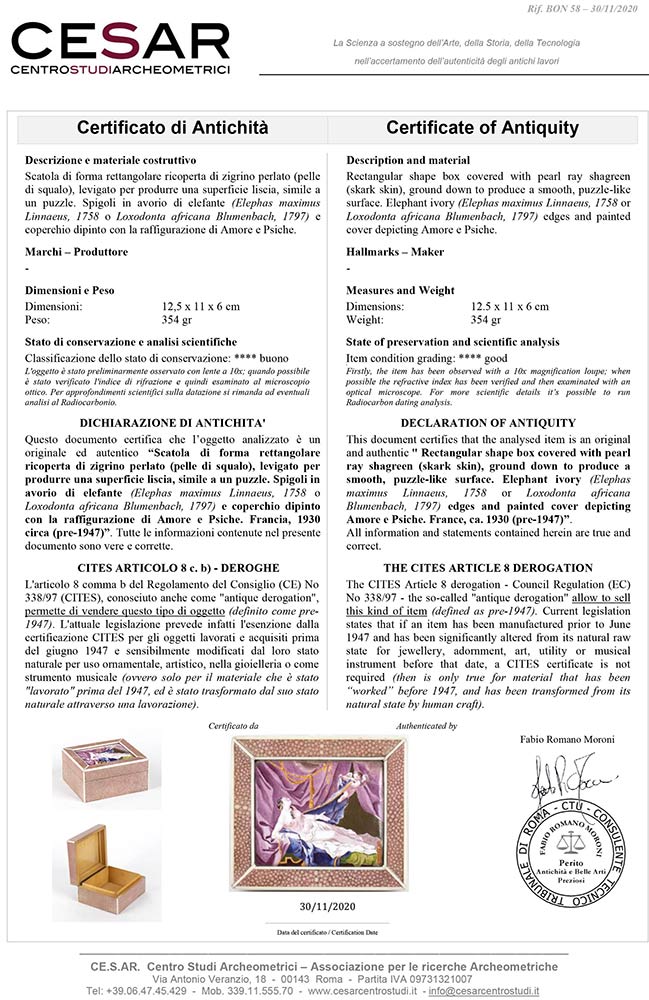 di forma rettangolare ricoperta di zigrino perlato (pelle di squalo), levigato per produrre una superficie liscia, simile a un puzzle. Spigoli in avorio di elefante (Elephas maximus Linnaeus, 1758 o Loxodonta africana Blumenbach, 1797) e coperchio dipinto con la raffigurazione di Amore e Psiche. Dimensioni 12,5 x 11 x 6 cm. Peso 354 gr. Stato di conservazione: **** buono. Accompagnato da certificato di antichità Ce.S.Ar. Centro Studi Archeometrici (pre-1947). uesto lotto contiene avorio/corallo/tartaruga o altre specie protette dalla regolamentazione CITES (the Convention on International Trade in Endangered Species of Wild Fauna and Flora). A causa dei recenti cambiamenti nella legislazione di molti paesi (ad es. USA o Cina) sulle specie in via di estinzione tra cui corallo, avorio e tartaruga - BFA raccomanda agli acquirenti di verificare con il proprio governo eventuali requisiti di importazione prima di effettuare un'offerta. Ad esempio, le normative statunitensi limitano l'importazione di avorio di elefante; BFA non assisterà quindi gli acquirenti nella spedizione di questo lotto negli Stati Uniti. Chi fosse interessato è pregato di mettersi in contatto con i nostri uffici prima dell'asta CITES ARTICOLO 8 c. b) – DEROGHE L'articolo 8 comma b del Regolamento del Consiglio (CE) No 338/97 (CITES), conosciuto anche come ""antique derogation"", permette di vendere questo tipo di oggetto (definito come pre-1947). L'attuale legislazione prevede infatti l'esenzione dalla certificazione CITES per gli oggetti lavorati e acquisiti prima del giugno 1947 e sensibilmente modificati dal loro stato naturale per uso ornamentale, artistico, nella gioielleria o come strumento musicale (ovvero solo per il materiale che è stato ""lavorato"" prima del 1947, ed è stato trasformato dal suo stato naturale attraverso una lavorazione). Il certificato gemmologico è disponibile a pagamento dopo l'asta