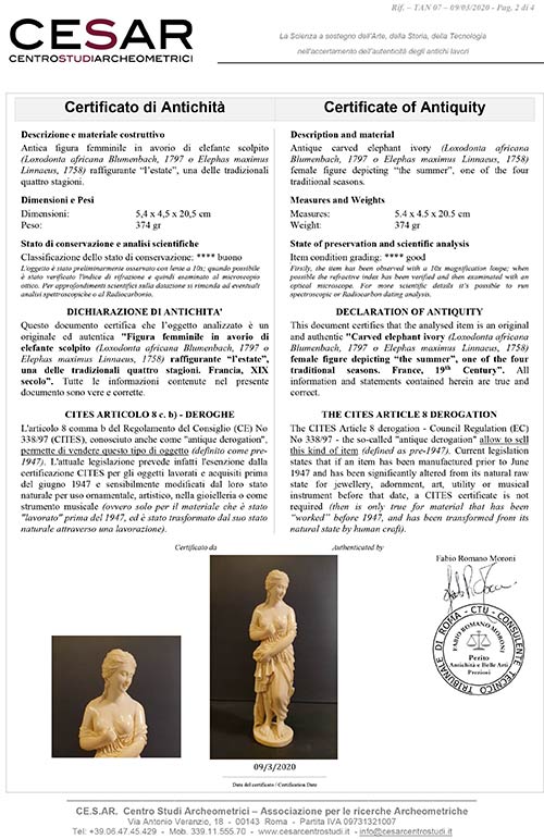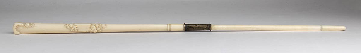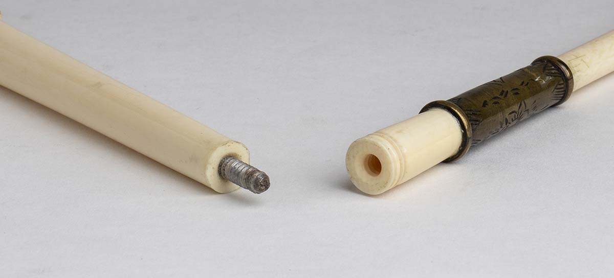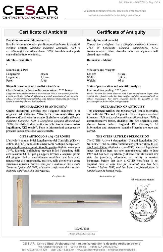 in avorio elefantino (Elephas maximus Linnaeus, 1758 o Loxodonta africana Blumenbach, 1797), divisibile in due parti, con collarino in ottone inciso. Lunghezza 50 cm, diametro massimo 1,8 cm. Peso 95 gr. Accompagnato da certificato di antichità Ce.S.Ar. Centro Studi Archeometrici (pre-1947). Questo lotto contiene avorio/corallo/tartaruga o altre specie protette dalla regolamentazione CITES (the Convention on International Trade in Endangered Species of Wild Fauna and Flora). A causa dei recenti cambiamenti nella legislazione di molti paesi (ad es. USA o Cina) sulle specie in via di estinzione tra cui corallo, avorio e tartaruga - BFA raccomanda agli acquirenti di verificare con il proprio governo eventuali requisiti di importazione prima di effettuare un'offerta. Ad esempio, le normative statunitensi limitano l'importazione di avorio di elefante; BFA non assisterà quindi gli acquirenti nella spedizione di questo lotto negli Stati Uniti. Chi fosse interessato è pregato di mettersi in contatto con i nostri uffici prima dell'asta CITES ARTICOLO 8 c. b) – DEROGHE L'articolo 8 comma b del Regolamento del Consiglio (CE) No 338/97 (CITES), conosciuto anche come ""antique derogation"", permette di vendere questo tipo di oggetto (definito come pre-1947). L'attuale legislazione prevede infatti l'esenzione dalla certificazione CITES per gli oggetti lavorati e acquisiti prima del giugno 1947 e sensibilmente modificati dal loro stato naturale per uso ornamentale, artistico, nella gioielleria o come strumento musicale (ovvero solo per il materiale che è stato ""lavorato"" prima del 1947, ed è stato trasformato dal suo stato naturale attraverso una lavorazione). Il certificato gemmologico è disponibile a pagamento dopo l'asta