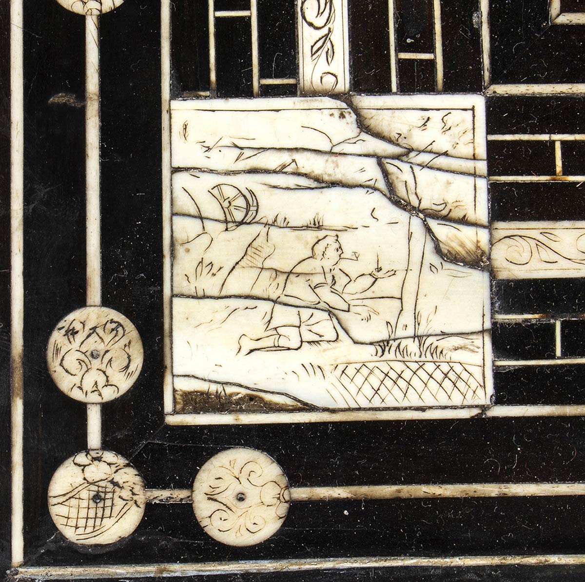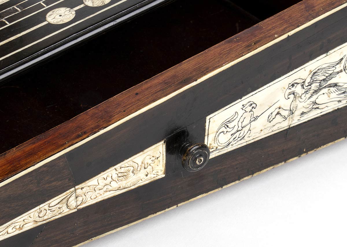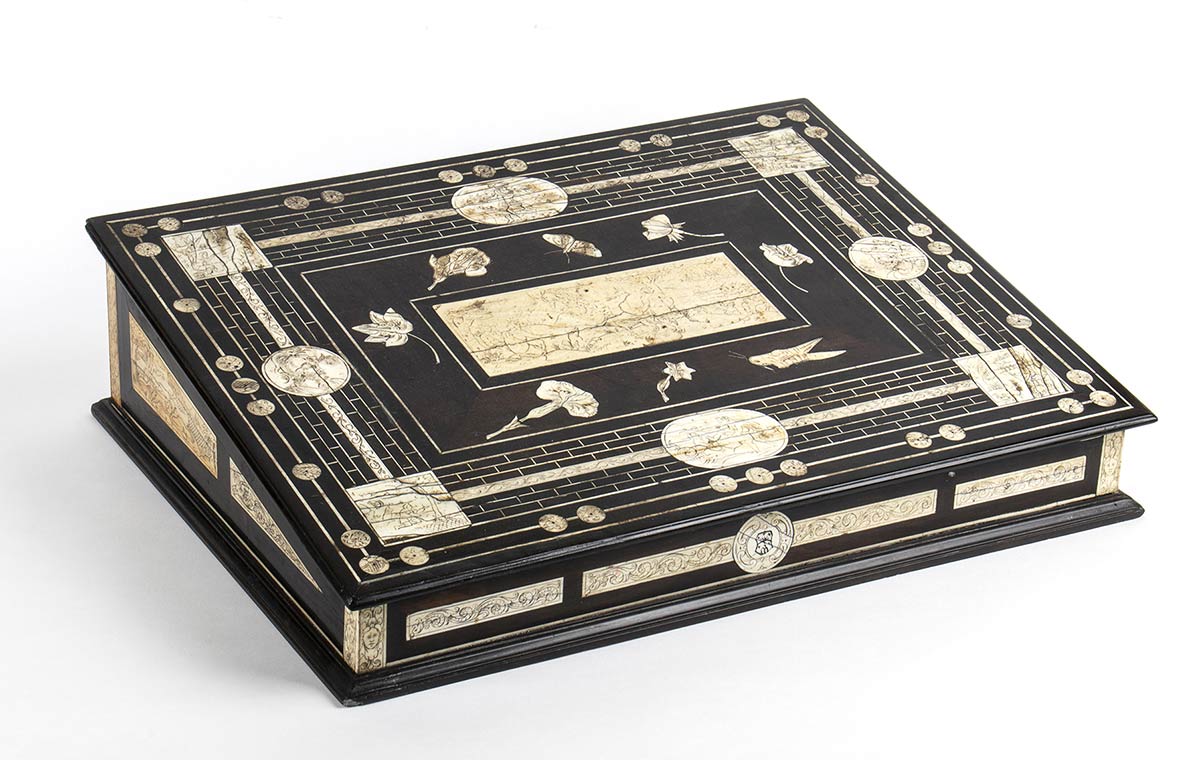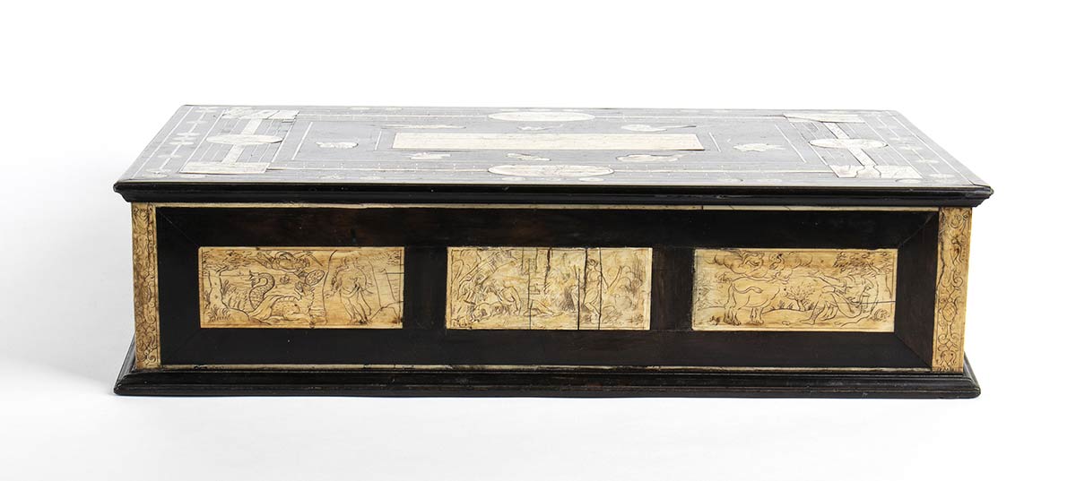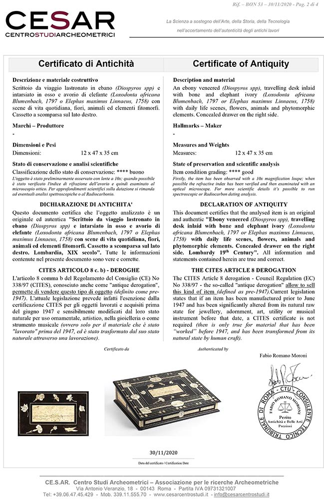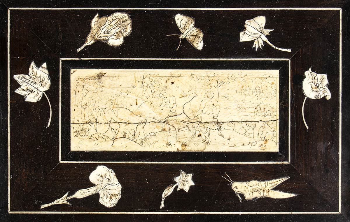 lastronato in ebano (Diospyros spp) e intarsiato in osso e avorio di elefante (Loxodonta africana Blumenbach, 1797 o Elephas maximus Linnaeus, 1758) con scene di vita quotidiana, fiori, animali ed elementi fitomorfi. Cassetto a scomparsa sul lato destro. Dimensioni 12 x 47 x 35 cm. Stato di conservazione: **** buono. Accompagnato da certificato di antichità Ce.S.Ar. Centro Studi Archeometrici (pre-1947). uesto lotto contiene avorio/corallo/tartaruga o altre specie protette dalla regolamentazione CITES (the Convention on International Trade in Endangered Species of Wild Fauna and Flora). A causa dei recenti cambiamenti nella legislazione di molti paesi (ad es. USA o Cina) sulle specie in via di estinzione tra cui corallo, avorio e tartaruga - BFA raccomanda agli acquirenti di verificare con il proprio governo eventuali requisiti di importazione prima di effettuare un'offerta. Ad esempio, le normative statunitensi limitano l'importazione di avorio di elefante; BFA non assisterà quindi gli acquirenti nella spedizione di questo lotto negli Stati Uniti. Chi fosse interessato è pregato di mettersi in contatto con i nostri uffici prima dell'asta CITES ARTICOLO 8 c. b) – DEROGHE L'articolo 8 comma b del Regolamento del Consiglio (CE) No 338/97 (CITES), conosciuto anche come ""antique derogation"", permette di vendere questo tipo di oggetto (definito come pre-1947). L'attuale legislazione prevede infatti l'esenzione dalla certificazione CITES per gli oggetti lavorati e acquisiti prima del giugno 1947 e sensibilmente modificati dal loro stato naturale per uso ornamentale, artistico, nella gioielleria o come strumento musicale (ovvero solo per il materiale che è stato ""lavorato"" prima del 1947, ed è stato trasformato dal suo stato naturale attraverso una lavorazione). Il certificato gemmologico è disponibile a pagamento dopo l'asta