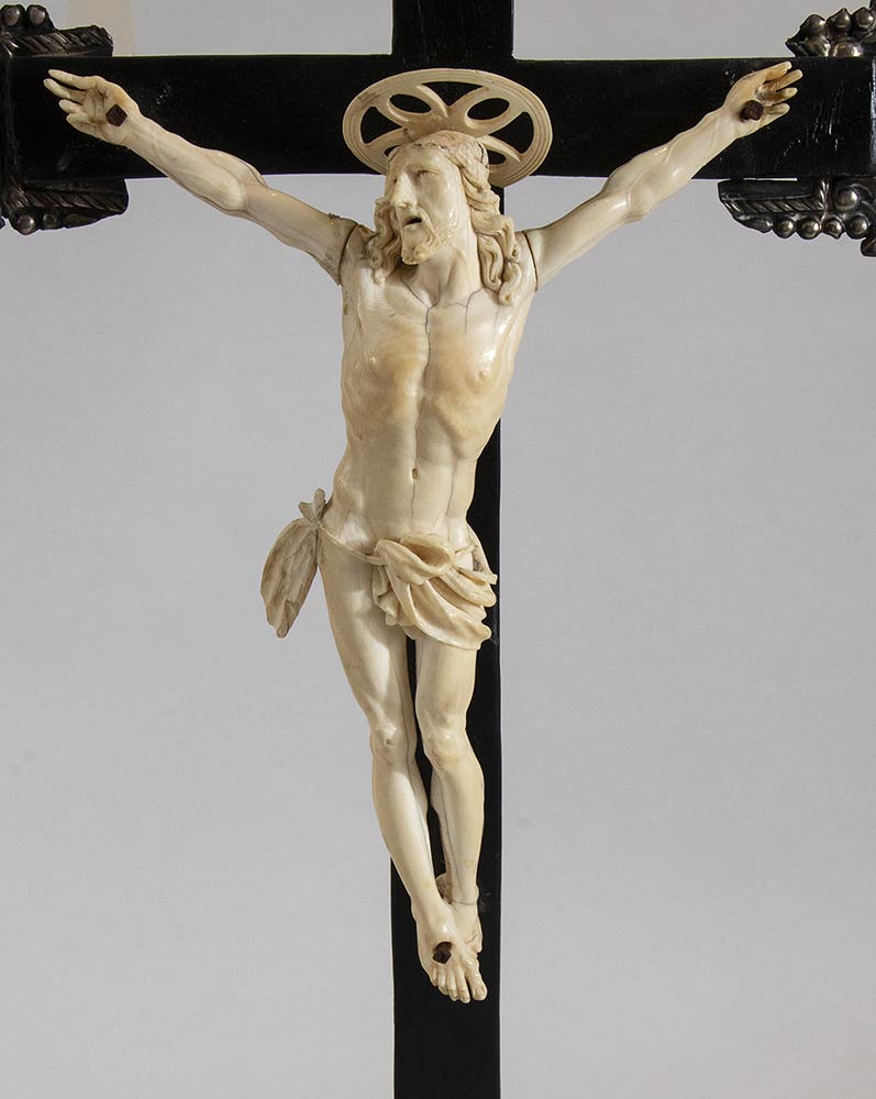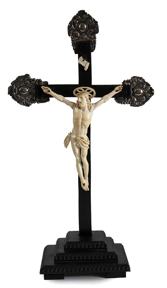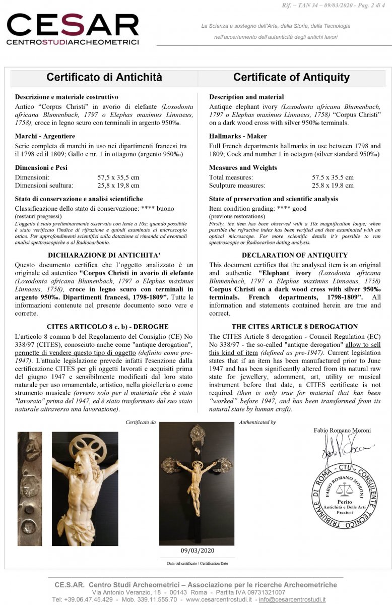 “Corpus Christi” in avorio di elefante scolpito (Loxodonta africana Blumenbach, 1797 o Elephas maximus Linnaeus, 1758) con croce in legno scuro con terminali in argento 950/1000. Serie completa di marchi in uso nei dipartimenti francesi tra il 1798 ed il 1809. Gallo e nr. 1 in ottagono per l'argento 950/1000. Dimensioni 57,5 x 35,5 cm, scultura 25,8 x 19,8 cm. Stato di conservazione: **** buono. Accompagnato da certificato di antichità Ce.S.Ar. Centro Studi Archeometrici (pre-1947).