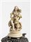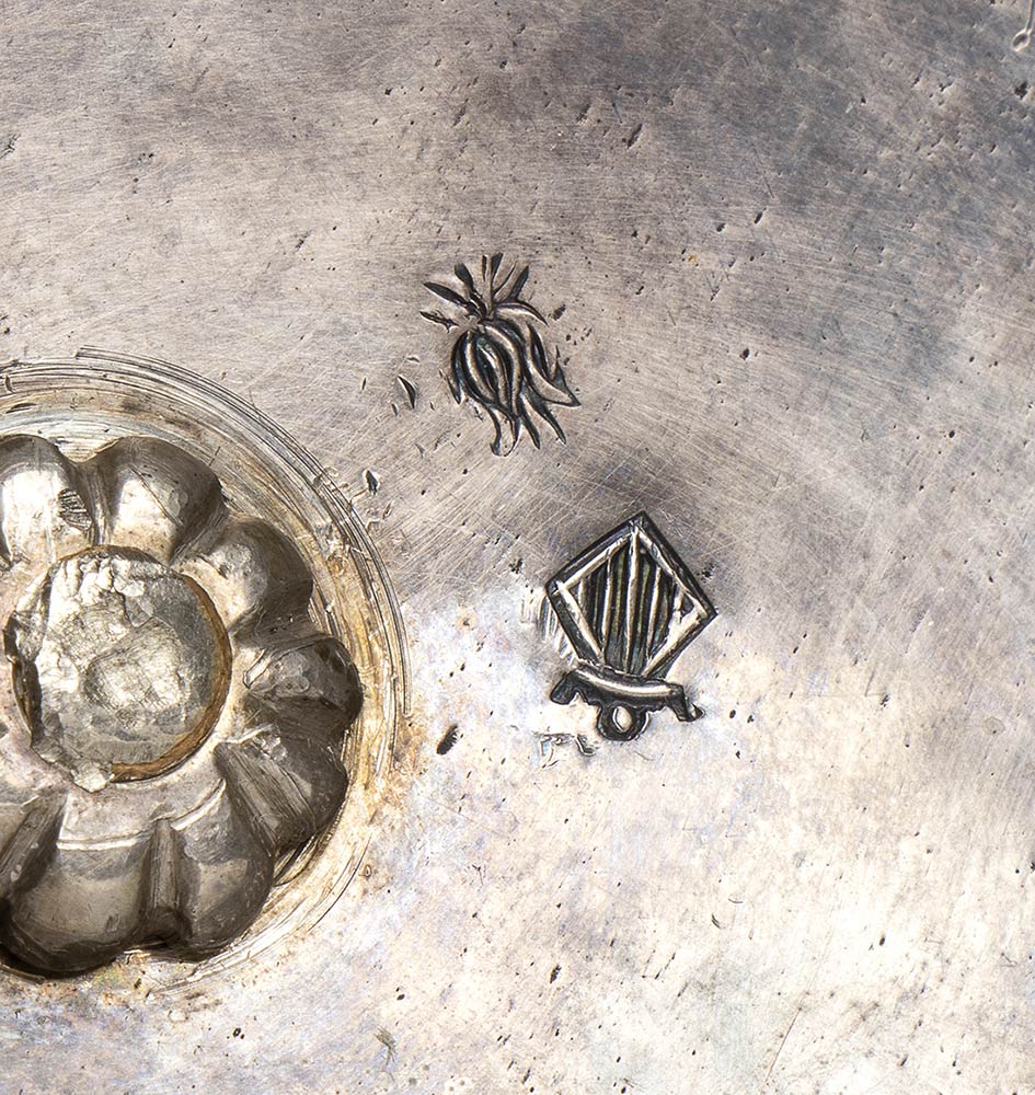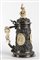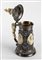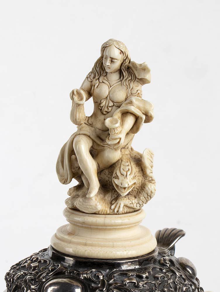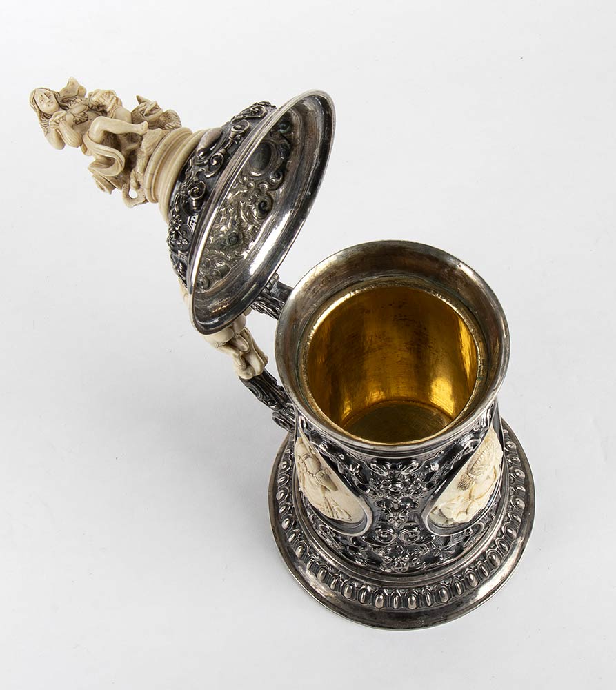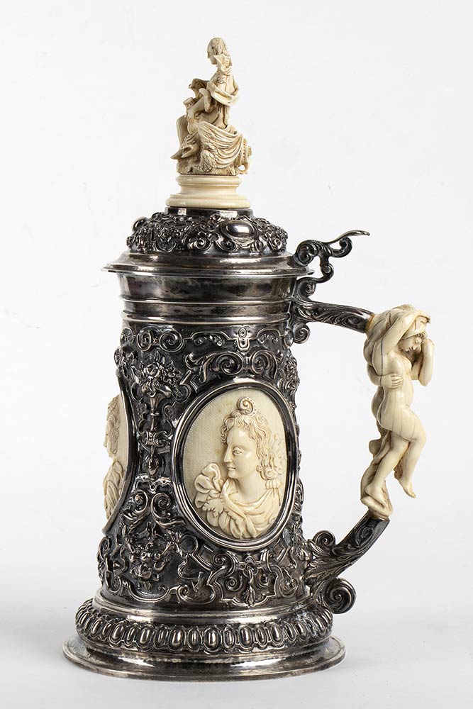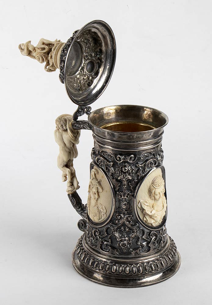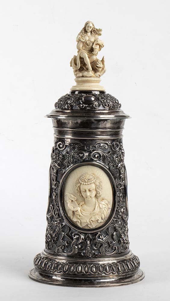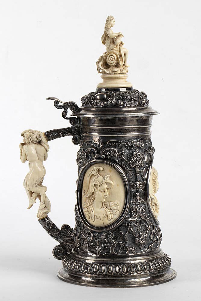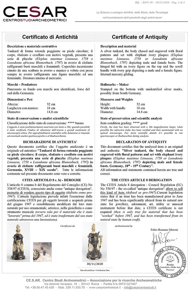 di forma rotonda poggiante su piede circolare; il corpo, sbalzato e cesellato con motivi vegetali, presenta una serie di placche in avorio di elefante (Elephas maximus Linnaeus, 1758 o Loxodonta africana Blumenbach, 1797) raffiguranti busti maschili e femminili. Coperchio incernierato cimato da una scultura e manico a voluta con presa sempre in avorio raffigurante una figura maschile ed una femminile. Doratura interna al mercurio. Punzonato su fondo con marchi non identificati, forse del sud della Germania. Altezza 32 cm, larghezza con manico 18 cm, diametro 14,8 cm. Stato di conservazione: **** buono. Accompagnato da certificato di antichità Ce.S.Ar. Centro Studi Archeometrici (pre-1947). uesto lotto contiene avorio/corallo/tartaruga o altre specie protette dalla regolamentazione CITES (the Convention on International Trade in Endangered Species of Wild Fauna and Flora). A causa dei recenti cambiamenti nella legislazione di molti paesi (ad es. USA o Cina) sulle specie in via di estinzione tra cui corallo, avorio e tartaruga - BFA raccomanda agli acquirenti di verificare con il proprio governo eventuali requisiti di importazione prima di effettuare un'offerta. Ad esempio, le normative statunitensi limitano l'importazione di avorio di elefante; BFA non assisterà quindi gli acquirenti nella spedizione di questo lotto negli Stati Uniti. Chi fosse interessato è pregato di mettersi in contatto con i nostri uffici prima dell'asta CITES ARTICOLO 8 c. b) – DEROGHE L'articolo 8 comma b del Regolamento del Consiglio (CE) No 338/97 (CITES), conosciuto anche come ""antique derogation"", permette di vendere questo tipo di oggetto (definito come pre-1947). L'attuale legislazione prevede infatti l'esenzione dalla certificazione CITES per gli oggetti lavorati e acquisiti prima del giugno 1947 e sensibilmente modificati dal loro stato naturale per uso ornamentale, artistico, nella gioielleria o come strumento musicale (ovvero solo per il materiale che è stato ""lavorato"" prima del 1947, ed è stato trasformato dal suo stato naturale attraverso una lavorazione). Il certificato gemmologico è disponibile a pagamento dopo l'asta
