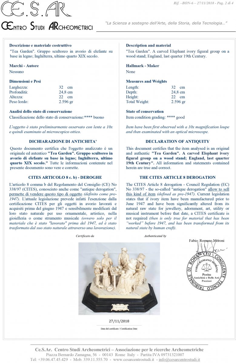 in avorio di elephante scolpito (Loxodonta africana Blumenbach, 1797 o Elephas maximus Linnaeus, 1758) su basamento ligneo. Larghezza 32 cm, profondità 24,8 cm, altezza 22 cm. Peso complessivo 2596 gr. Stato di conservazione: **** buono. Accompagnato da certificato di antichità Ce.S.Ar. Centro Studi Archeometrici (pre-1947). uesto lotto contiene avorio/corallo/tartaruga o altre specie protette dalla regolamentazione CITES (the Convention on International Trade in Endangered Species of Wild Fauna and Flora). A causa dei recenti cambiamenti nella legislazione di molti paesi (ad es. USA o Cina) sulle specie in via di estinzione tra cui corallo, avorio e tartaruga - BFA raccomanda agli acquirenti di verificare con il proprio governo eventuali requisiti di importazione prima di effettuare un'offerta. Ad esempio, le normative statunitensi limitano l'importazione di avorio di elefante; BFA non assisterà quindi gli acquirenti nella spedizione di questo lotto negli Stati Uniti. Chi fosse interessato è pregato di mettersi in contatto con i nostri uffici prima dell'asta CITES ARTICOLO 8 c. b) – DEROGHE L'articolo 8 comma b del Regolamento del Consiglio (CE) No 338/97 (CITES), conosciuto anche come ""antique derogation"", permette di vendere questo tipo di oggetto (definito come pre-1947). L'attuale legislazione prevede infatti l'esenzione dalla certificazione CITES per gli oggetti lavorati e acquisiti prima del giugno 1947 e sensibilmente modificati dal loro stato naturale per uso ornamentale, artistico, nella gioielleria o come strumento musicale (ovvero solo per il materiale che è stato ""lavorato"" prima del 1947, ed è stato trasformato dal suo stato naturale attraverso una lavorazione). Il certificato gemmologico è disponibile a pagamento dopo l'asta