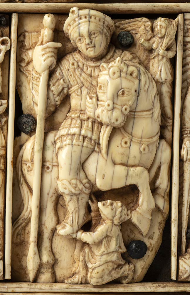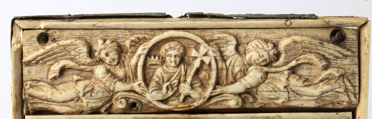 Nel pannello superiore sono rappresentati due angeli che portano una imago clipeata, un medaglione rotondo con il busto di Cristo; il Salvatore tiene uno scettro con una croce, guarda direttamente verso di noi e fa un gesto di benedizione; intorno a lui è un simbolo del sole.