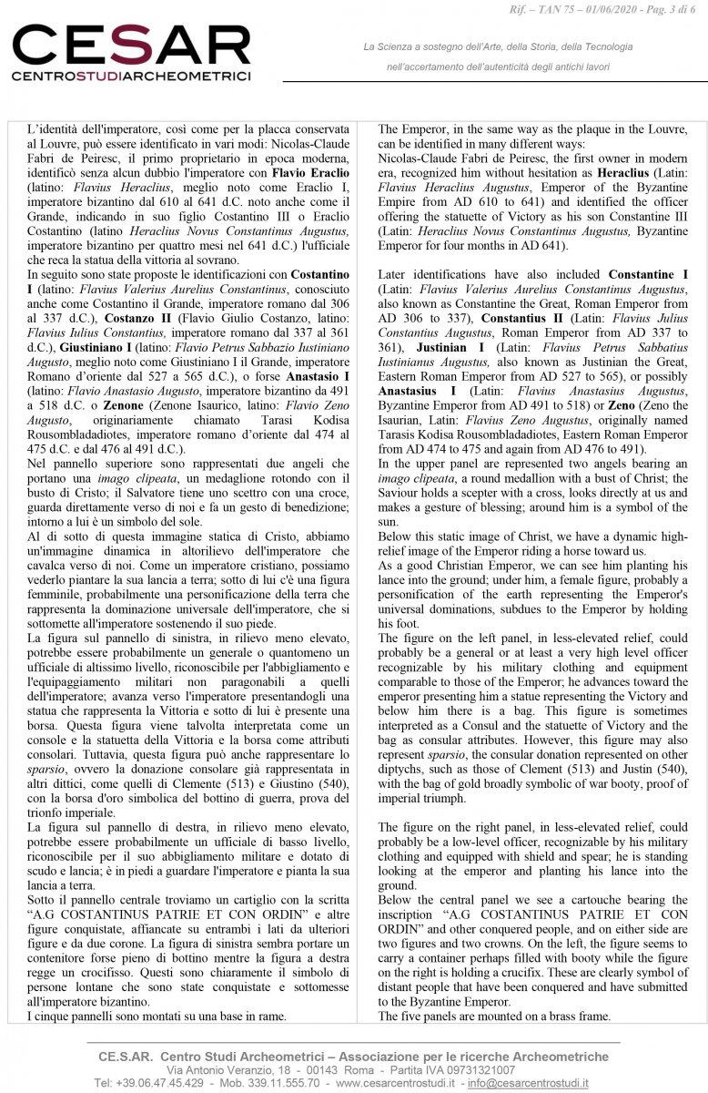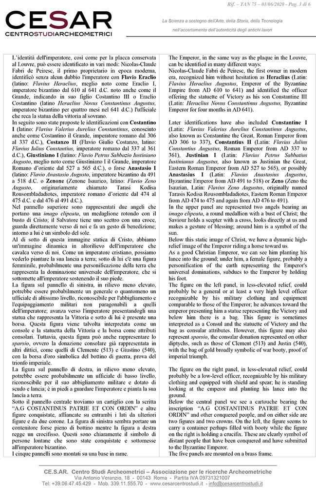 Con la stessa iconografia, nella placca in esame è raffigurato nel pannello centrale l’imperatore a cavallo in vesti militari mentre trionfa sui nemici che sono prostrati ai suoi piedi e nel pannello superiore viene raffigurato Cristo Pantocratore nell’atto di incoronare l’imperatore. L’identità dell'imperatore, così come per la placca conservata al Louvre, può essere identificato in vari modi: Nicolas-Claude Fabri de Peiresc, il primo proprietario in epoca moderna, identificò senza alcun dubbio l'imperatore con Flavio Eraclio (latino: Flavius Heraclius, meglio noto come Eraclio I, imperatore bizantino dal 610 al 641 d.C. noto anche come il Grande), indicando in suo figlio Costantino III o Eraclio Costantino (latino Heraclius Novus Constantinus Augustus, imperatore bizantino per quattro mesi nel 641 d.C.) l'ufficiale che reca la statua della vittoria al sovrano.