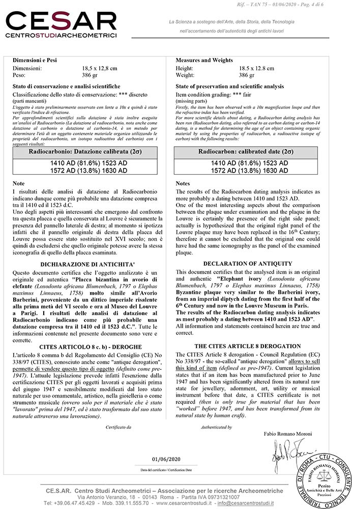 uesto lotto contiene avorio/corallo/tartaruga o altre specie protette dalla regolamentazione CITES (the Convention on International Trade in Endangered Species of Wild Fauna and Flora). A causa dei recenti cambiamenti nella legislazione di molti paesi (ad es. USA o Cina) sulle specie in via di estinzione tra cui corallo, avorio e tartaruga - BFA raccomanda agli acquirenti di verificare con il proprio governo eventuali requisiti di importazione prima di effettuare un'offerta. Ad esempio, le normative statunitensi limitano l'importazione di avorio di elefante; BFA non assisterà quindi gli acquirenti nella spedizione di questo lotto negli Stati Uniti. Chi fosse interessato è pregato di mettersi in contatto con i nostri uffici prima dell'asta CITES ARTICOLO 8 c. b) – DEROGHE L'articolo 8 comma b del Regolamento del Consiglio (CE) No 338/97 (CITES), conosciuto anche come ""antique derogation"", permette di vendere questo tipo di oggetto (definito come pre-1947). L'attuale legislazione prevede infatti l'esenzione dalla certificazione CITES per gli oggetti lavorati e acquisiti prima del giugno 1947 e sensibilmente modificati dal loro stato naturale per uso ornamentale, artistico, nella gioielleria o come strumento musicale (ovvero solo per il materiale che è stato ""lavorato"" prima del 1947, ed è stato trasformato dal suo stato naturale attraverso una lavorazione). Il certificato gemmologico è disponibile a pagamento dopo l'asta