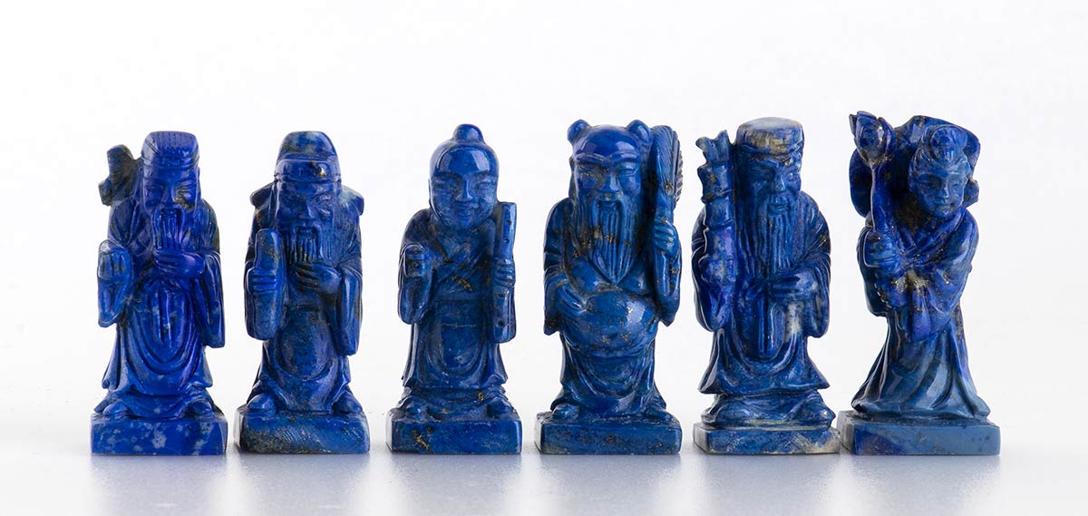 in lapislazzulo, raffiguranti i sette saggi della buona fortuna. Dimensioni 5,6 x 2,3 x 2,3 cm. Peso totale 251 gr. Stato di conservazione: **** buono. Questo lotto disponibile per la vendita solo con spedizioni all’interno della Comunità Europea. uesto lotto contiene avorio/corallo/tartaruga o altre specie protette dalla regolamentazione CITES (the Convention on International Trade in Endangered Species of Wild Fauna and Flora). A causa dei recenti cambiamenti nella legislazione di molti paesi (ad es. USA o Cina) sulle specie in via di estinzione tra cui corallo, avorio e tartaruga - BFA raccomanda agli acquirenti di verificare con il proprio governo eventuali requisiti di importazione prima di effettuare un'offerta. Ad esempio, le normative statunitensi limitano l'importazione di avorio di elefante; BFA non assisterà quindi gli acquirenti nella spedizione di questo lotto negli Stati Uniti. Chi fosse interessato è pregato di mettersi in contatto con i nostri uffici prima dell'asta CITES ARTICOLO 8 c. b) – DEROGHE L'articolo 8 comma b del Regolamento del Consiglio (CE) No 338/97 (CITES), conosciuto anche come ""antique derogation"", permette di vendere questo tipo di oggetto (definito come pre-1947). L'attuale legislazione prevede infatti l'esenzione dalla certificazione CITES per gli oggetti lavorati e acquisiti prima del giugno 1947 e sensibilmente modificati dal loro stato naturale per uso ornamentale, artistico, nella gioielleria o come strumento musicale (ovvero solo per il materiale che è stato ""lavorato"" prima del 1947, ed è stato trasformato dal suo stato naturale attraverso una lavorazione). Il certificato gemmologico è disponibile a pagamento dopo l'asta