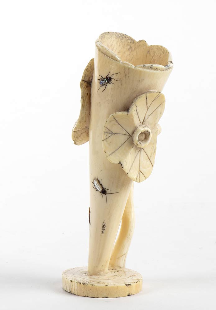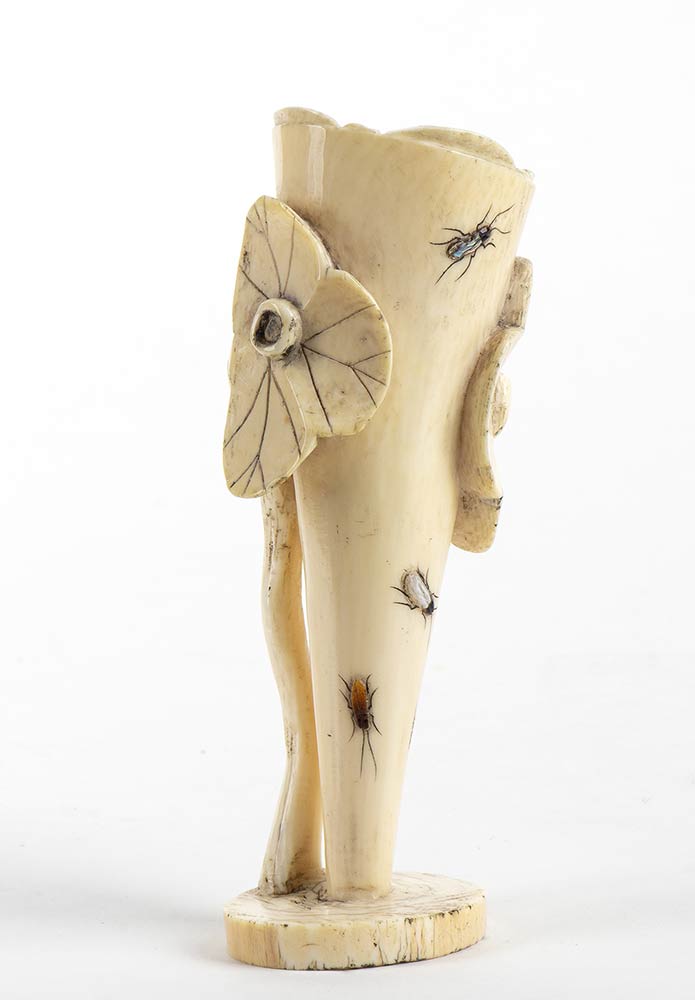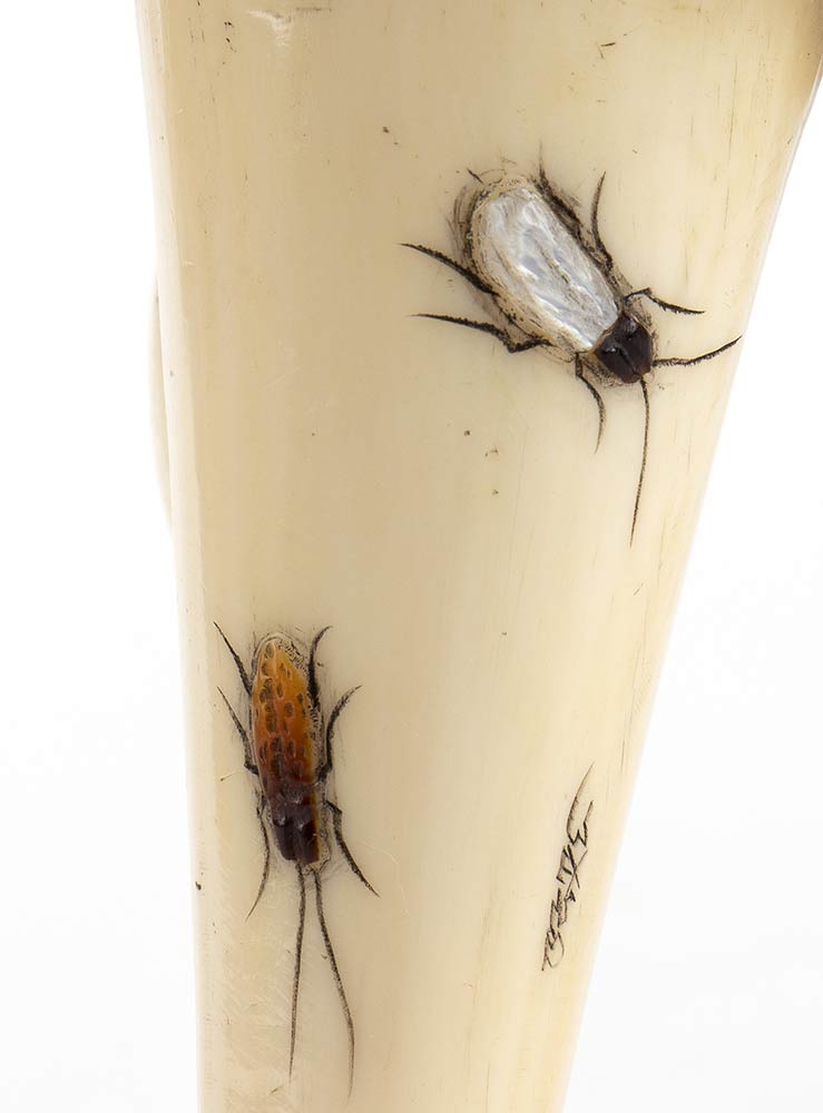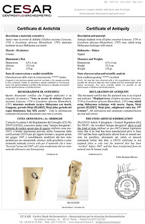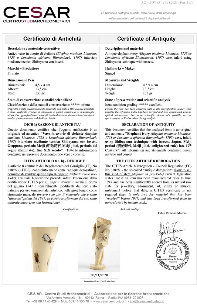 in avorio di elefante (Elephas maximus Linnaeus, 1758 o Loxodonta africana Blumenbach, 1797) intarsiato mediante tecnica Shibayama con insetti. Firmato. Dimensioni 4,5 x 4 cm, altezza 13,5 cm. Peso 133 gr. Stato di conservazione: ***** ottimo. Accompagnato da certificato di antichità Ce.S.Ar. Centro Studi Archeometrici (pre-1947). Questo lotto disponibile per la vendita solo con spedizioni all’interno della Comunità Europea. uesto lotto contiene avorio/corallo/tartaruga o altre specie protette dalla regolamentazione CITES (the Convention on International Trade in Endangered Species of Wild Fauna and Flora). A causa dei recenti cambiamenti nella legislazione di molti paesi (ad es. USA o Cina) sulle specie in via di estinzione tra cui corallo, avorio e tartaruga - BFA raccomanda agli acquirenti di verificare con il proprio governo eventuali requisiti di importazione prima di effettuare un'offerta. Ad esempio, le normative statunitensi limitano l'importazione di avorio di elefante; BFA non assisterà quindi gli acquirenti nella spedizione di questo lotto negli Stati Uniti. Chi fosse interessato è pregato di mettersi in contatto con i nostri uffici prima dell'asta CITES ARTICOLO 8 c. b) – DEROGHE L'articolo 8 comma b del Regolamento del Consiglio (CE) No 338/97 (CITES), conosciuto anche come ""antique derogation"", permette di vendere questo tipo di oggetto (definito come pre-1947). L'attuale legislazione prevede infatti l'esenzione dalla certificazione CITES per gli oggetti lavorati e acquisiti prima del giugno 1947 e sensibilmente modificati dal loro stato naturale per uso ornamentale, artistico, nella gioielleria o come strumento musicale (ovvero solo per il materiale che è stato ""lavorato"" prima del 1947, ed è stato trasformato dal suo stato naturale attraverso una lavorazione). Il certificato gemmologico è disponibile a pagamento dopo l'asta