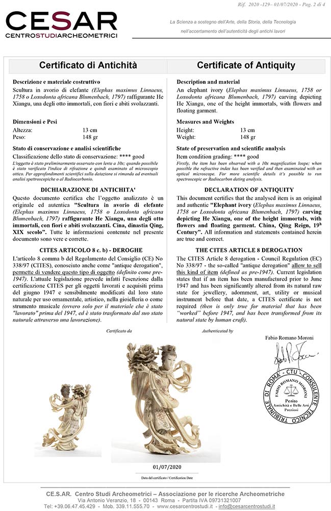 in avorio di elefante (Elephas maximus Linnaeus, 1758 o Loxodonta africana Blumenbach, 1797) policromo raffigurante He Xiangu, una degli otto immortali, con fiori e abiti svolazzanti. Altezza 13 cm. Peso 148 gr. Stato di conservazione: **** buono. Accompagnato da certificato di antichità Ce.S.Ar. Centro Studi Archeometrici (pre-1947). Questo lotto disponibile per la vendita solo con spedizioni all’interno della Comunità Europea. uesto lotto contiene avorio/corallo/tartaruga o altre specie protette dalla regolamentazione CITES (the Convention on International Trade in Endangered Species of Wild Fauna and Flora). A causa dei recenti cambiamenti nella legislazione di molti paesi (ad es. USA o Cina) sulle specie in via di estinzione tra cui corallo, avorio e tartaruga - BFA raccomanda agli acquirenti di verificare con il proprio governo eventuali requisiti di importazione prima di effettuare un'offerta. Ad esempio, le normative statunitensi limitano l'importazione di avorio di elefante; BFA non assisterà quindi gli acquirenti nella spedizione di questo lotto negli Stati Uniti. Chi fosse interessato è pregato di mettersi in contatto con i nostri uffici prima dell'asta CITES ARTICOLO 8 c. b) – DEROGHE L'articolo 8 comma b del Regolamento del Consiglio (CE) No 338/97 (CITES), conosciuto anche come ""antique derogation"", permette di vendere questo tipo di oggetto (definito come pre-1947). L'attuale legislazione prevede infatti l'esenzione dalla certificazione CITES per gli oggetti lavorati e acquisiti prima del giugno 1947 e sensibilmente modificati dal loro stato naturale per uso ornamentale, artistico, nella gioielleria o come strumento musicale (ovvero solo per il materiale che è stato ""lavorato"" prima del 1947, ed è stato trasformato dal suo stato naturale attraverso una lavorazione). Il certificato gemmologico è disponibile a pagamento dopo l'asta