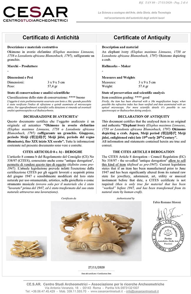 in avorio elefantino (Elephas maximus Linnaeus, 1758 o Loxodonta africana Blumenbach, 1797) raffigurante un granchio. Dimensioni 3 x 9 x 5 cm. Peso 57,4 gr. Stato di conservazione: **** buono. Accompagnato da certificato di antichità Ce.S.Ar. Centro Studi Archeometrici (pre-1947). Questo lotto disponibile per la vendita solo con spedizioni all’interno della Comunità Europea. uesto lotto contiene avorio/corallo/tartaruga o altre specie protette dalla regolamentazione CITES (the Convention on International Trade in Endangered Species of Wild Fauna and Flora). A causa dei recenti cambiamenti nella legislazione di molti paesi (ad es. USA o Cina) sulle specie in via di estinzione tra cui corallo, avorio e tartaruga - BFA raccomanda agli acquirenti di verificare con il proprio governo eventuali requisiti di importazione prima di effettuare un'offerta. Ad esempio, le normative statunitensi limitano l'importazione di avorio di elefante; BFA non assisterà quindi gli acquirenti nella spedizione di questo lotto negli Stati Uniti. Chi fosse interessato è pregato di mettersi in contatto con i nostri uffici prima dell'asta CITES ARTICOLO 8 c. b) – DEROGHE L'articolo 8 comma b del Regolamento del Consiglio (CE) No 338/97 (CITES), conosciuto anche come ""antique derogation"", permette di vendere questo tipo di oggetto (definito come pre-1947). L'attuale legislazione prevede infatti l'esenzione dalla certificazione CITES per gli oggetti lavorati e acquisiti prima del giugno 1947 e sensibilmente modificati dal loro stato naturale per uso ornamentale, artistico, nella gioielleria o come strumento musicale (ovvero solo per il materiale che è stato ""lavorato"" prima del 1947, ed è stato trasformato dal suo stato naturale attraverso una lavorazione). Il certificato gemmologico è disponibile a pagamento dopo l'asta