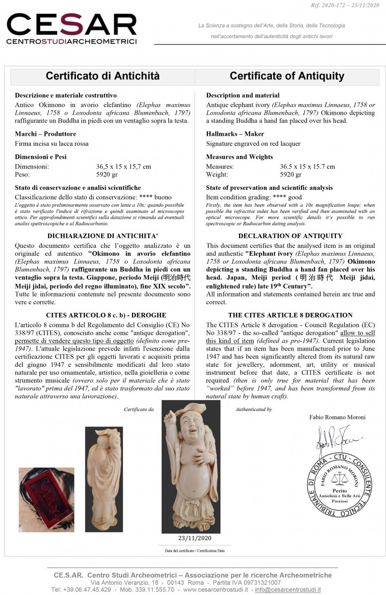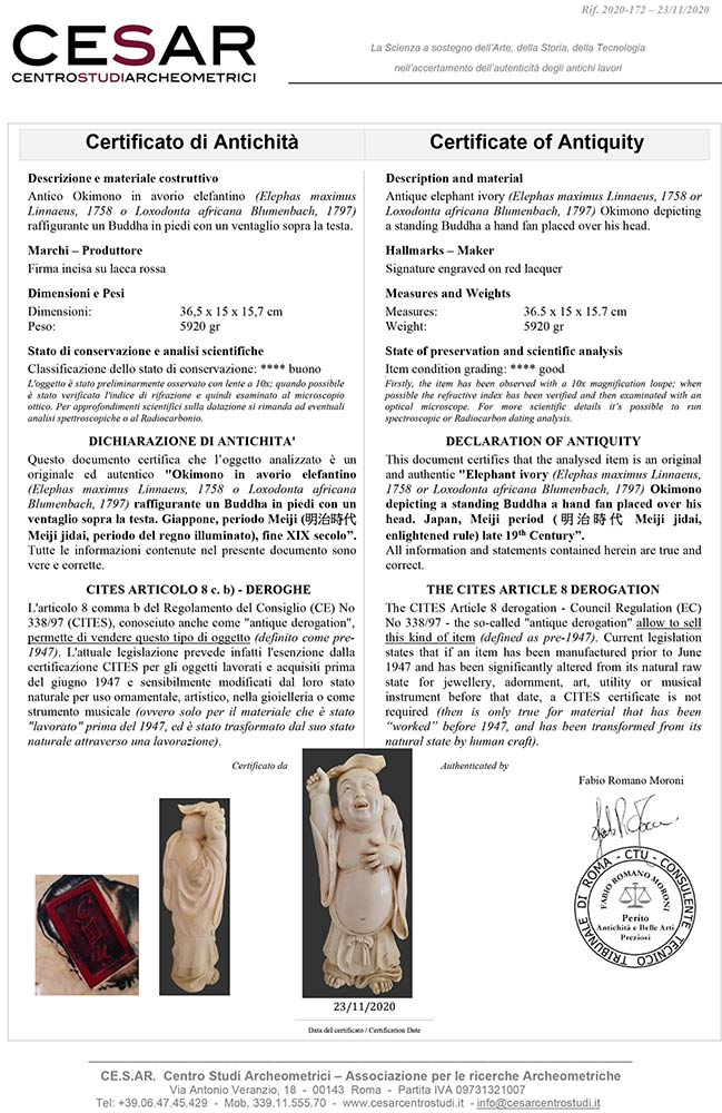 in avorio di elefante (Elephas maximus Linnaeus, 1758 o Loxodonta africana Blumenbach, 1797), raffigurante un Buddha in piedi con un ventaglio sopra la testa. Firmato su lacca rossa nella parte sottostante. Dimensioni 15 x 15,7 cm, altezza 36,5 cm. Peso totale 5920 gr. Stato di conservazione: **** buono. Accompagnato da certificato di antichità Ce.S.Ar. Centro Studi Archeometrici (pre-1947). Questo lotto disponibile per la vendita solo con spedizioni all’interno della Comunità Europea. uesto lotto contiene avorio/corallo/tartaruga o altre specie protette dalla regolamentazione CITES (the Convention on International Trade in Endangered Species of Wild Fauna and Flora). A causa dei recenti cambiamenti nella legislazione di molti paesi (ad es. USA o Cina) sulle specie in via di estinzione tra cui corallo, avorio e tartaruga - BFA raccomanda agli acquirenti di verificare con il proprio governo eventuali requisiti di importazione prima di effettuare un'offerta. Ad esempio, le normative statunitensi limitano l'importazione di avorio di elefante; BFA non assisterà quindi gli acquirenti nella spedizione di questo lotto negli Stati Uniti. Chi fosse interessato è pregato di mettersi in contatto con i nostri uffici prima dell'asta CITES ARTICOLO 8 c. b) – DEROGHE L'articolo 8 comma b del Regolamento del Consiglio (CE) No 338/97 (CITES), conosciuto anche come ""antique derogation"", permette di vendere questo tipo di oggetto (definito come pre-1947). L'attuale legislazione prevede infatti l'esenzione dalla certificazione CITES per gli oggetti lavorati e acquisiti prima del giugno 1947 e sensibilmente modificati dal loro stato naturale per uso ornamentale, artistico, nella gioielleria o come strumento musicale (ovvero solo per il materiale che è stato ""lavorato"" prima del 1947, ed è stato trasformato dal suo stato naturale attraverso una lavorazione). Il certificato gemmologico è disponibile a pagamento dopo l'asta