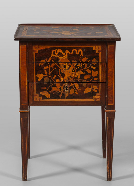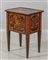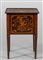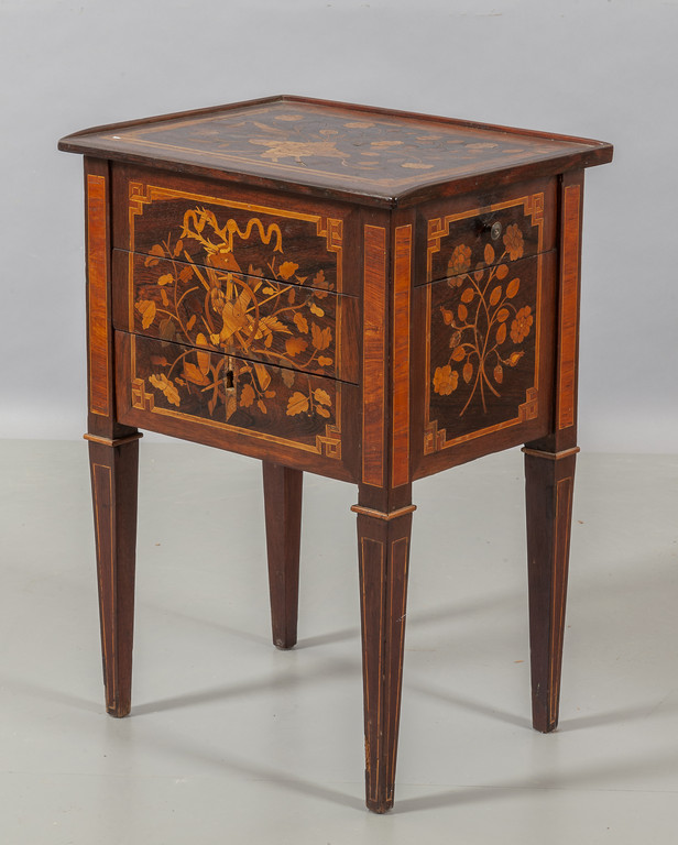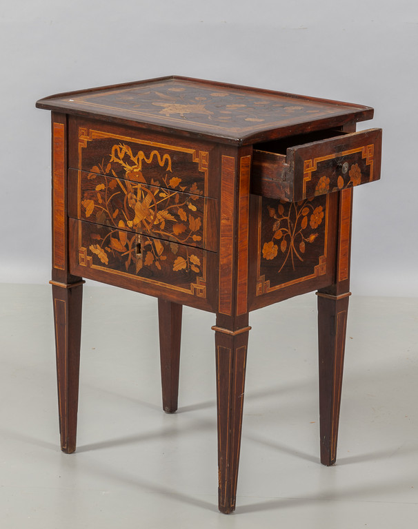 Comodino Luigi XVI a tre cassetti lastronato e riccamente intarsiato a motivi floreali, fine sec.XVIII