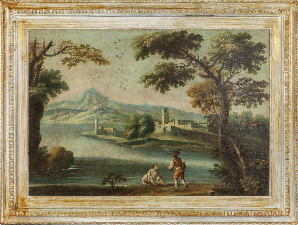 Scuola piemontese sec.XVIII "Paesaggi con figure" coppia di olii