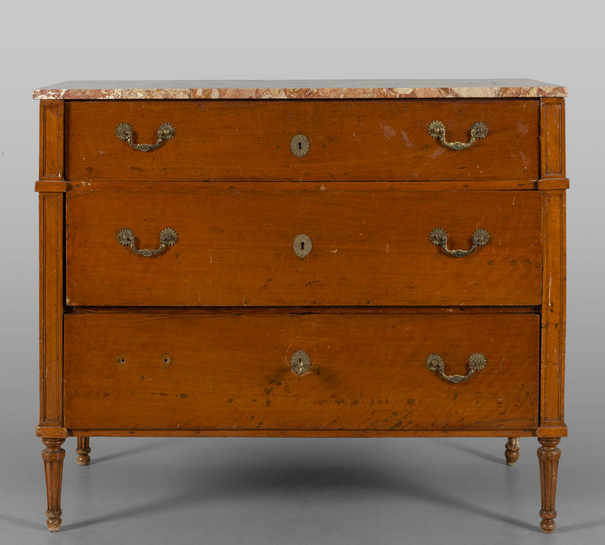 Comò Luigi XVI in noce, montanti con pilastrini, piano in marmo, Genova fine sec.XVIII